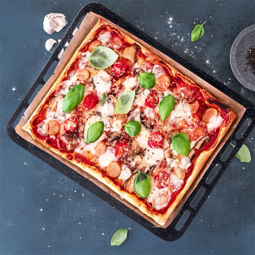 - Blacha emaliowana z nieprzywierającą powłoką do pieczenia ciast, mięsa, pizzy czy warzyw. Blacha nadaje się do piekarników gazowych oraz elektrycznych.