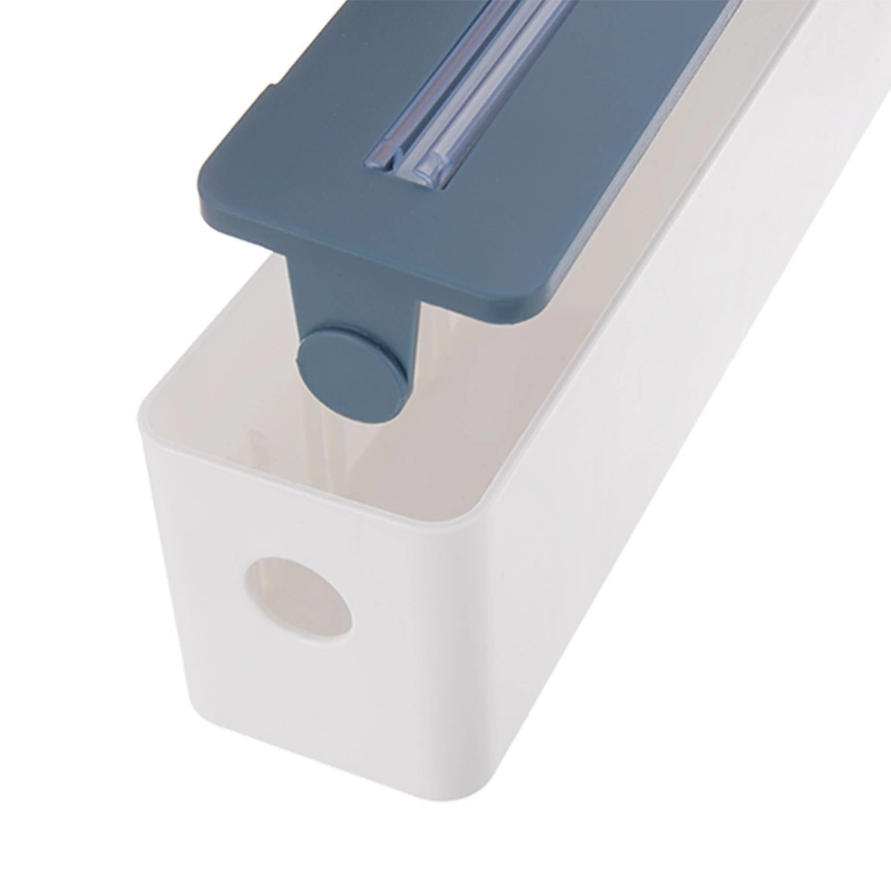 - Prosta instalacja i wymiana rolki - Wystarczy nacisnąć boczne zatrzaski, otworzyć pojemnik i umieścić rolkę na zaczepach. Folia przechodzi przez wycięcie, a po zamknięciu wieczka jest gotowa do cięcia.