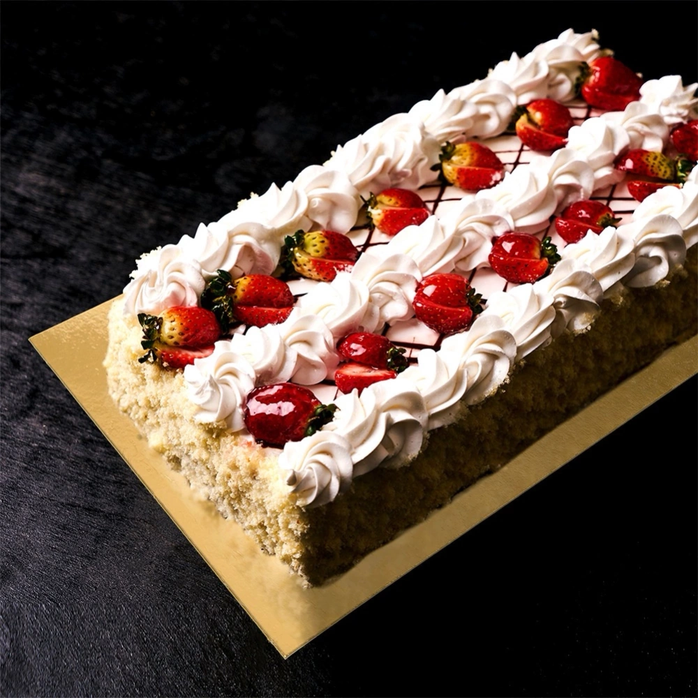 - Podkładka pod tort o wymiarach 40x30 cm z gładkimi bokami. Wykonana z grubej tektury, powlekanej z obu stron folią w kolorze złotym. Stanowi element dekoracyjny.