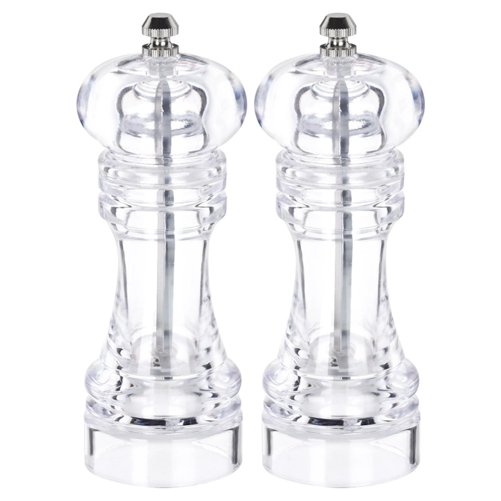 - Zestaw dwóch ręcznych młynków do mielenia pieprzu i soli. Wykonane z przezroczystego akrylu. Świetnie prezentują się na stole. Ceramiczny mechanizm mielący.