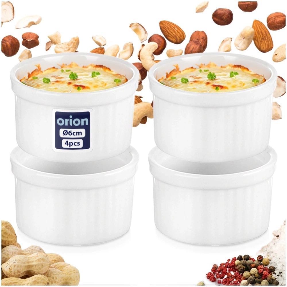 - Zestaw czterech małych miseczek o uniwersalnym zastosowaniu. Wykonane z porcelany w białym kolorze. Idealne na dipy oraz przekąski. Nadają się do zmywarki i zapiekania.