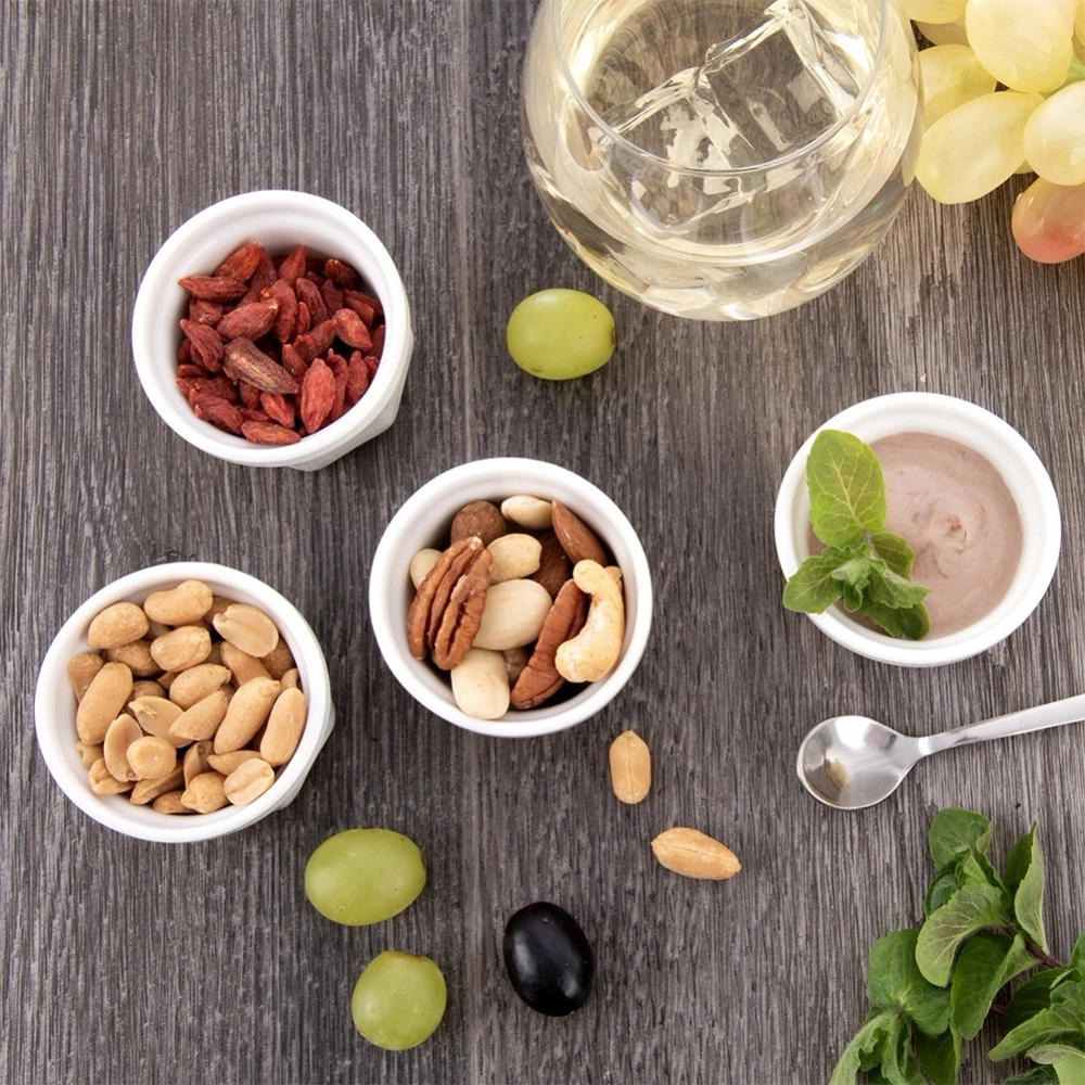 - Uniwersalne zastosowanie - Idealnie sprawdzą się do serwowania małych przekąsek, np. orzeszków, suszonych owoców. Miseczki można wykorzystać również do podawania mini deserów, dipów i sosów.