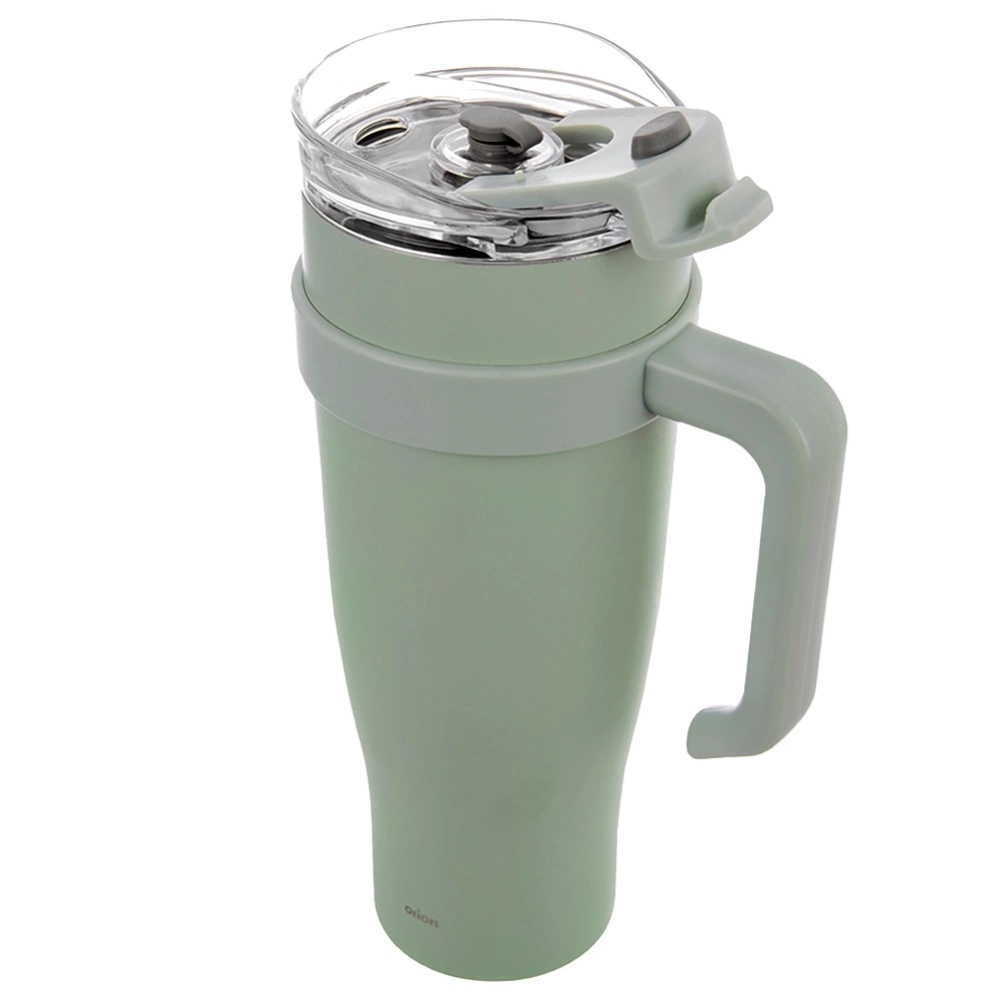 - Duży kubek termiczny z uchwytem, wykonany ze stali nierdzewnej. Dzięki podwójnym ściankom utrzymuje temperaturę napojów gorących do 12 godzin, a zimnych do 8 godzin.