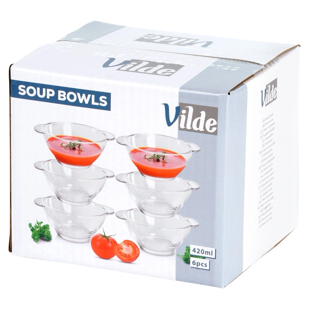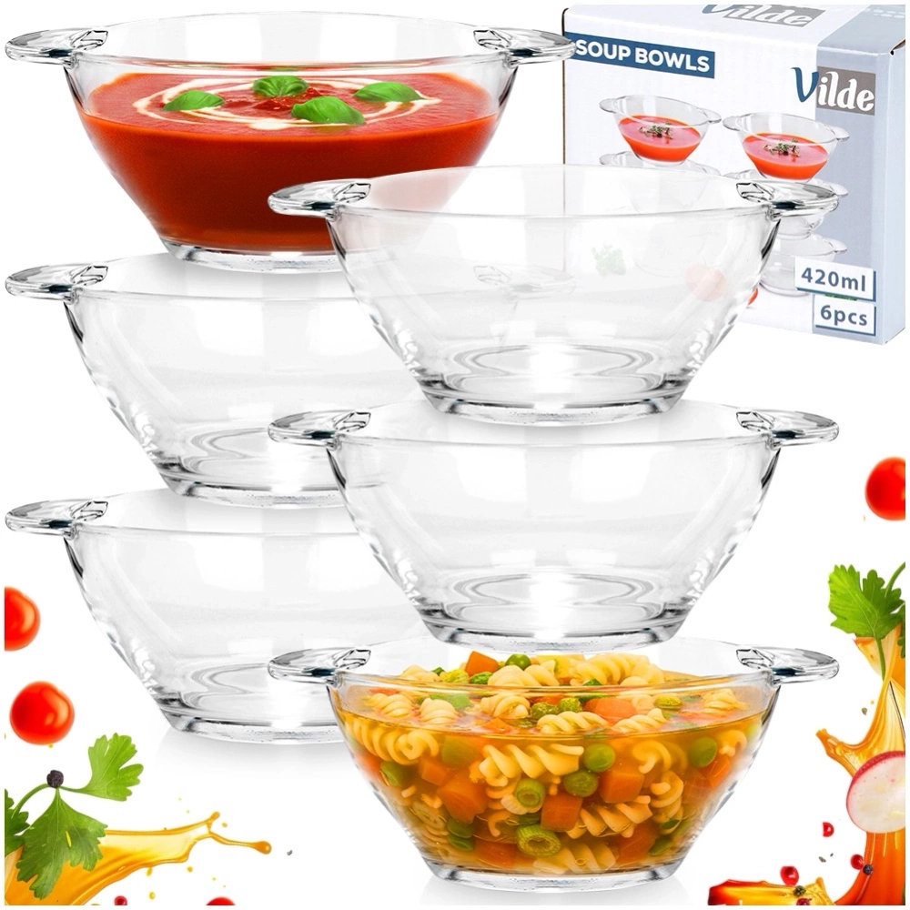 - Zestaw 6 szt. misek bulionówek o pojemności 420 ml. Wykonane z przezroczystego szkła. Każda z misek posiada uchwyty do przenoszenia. Nadają się do zmywarki.