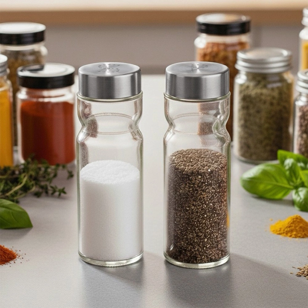 - Zestaw dwóch pojemników do podawania soli i pieprzu. Wykonane z grubego, przezroczystego szkła. Niezbędny zestaw w każdej kuchni.