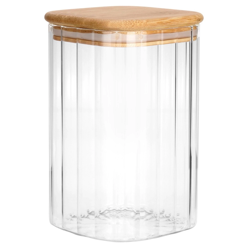 - Kwadratowy pojemnik szklany z drewnianą pokrywką. Idealny do przechowywania różnych produktów spożywczych. Szczelny dzięki silikonowej uszczelce. Nadaje się do zmywarki.