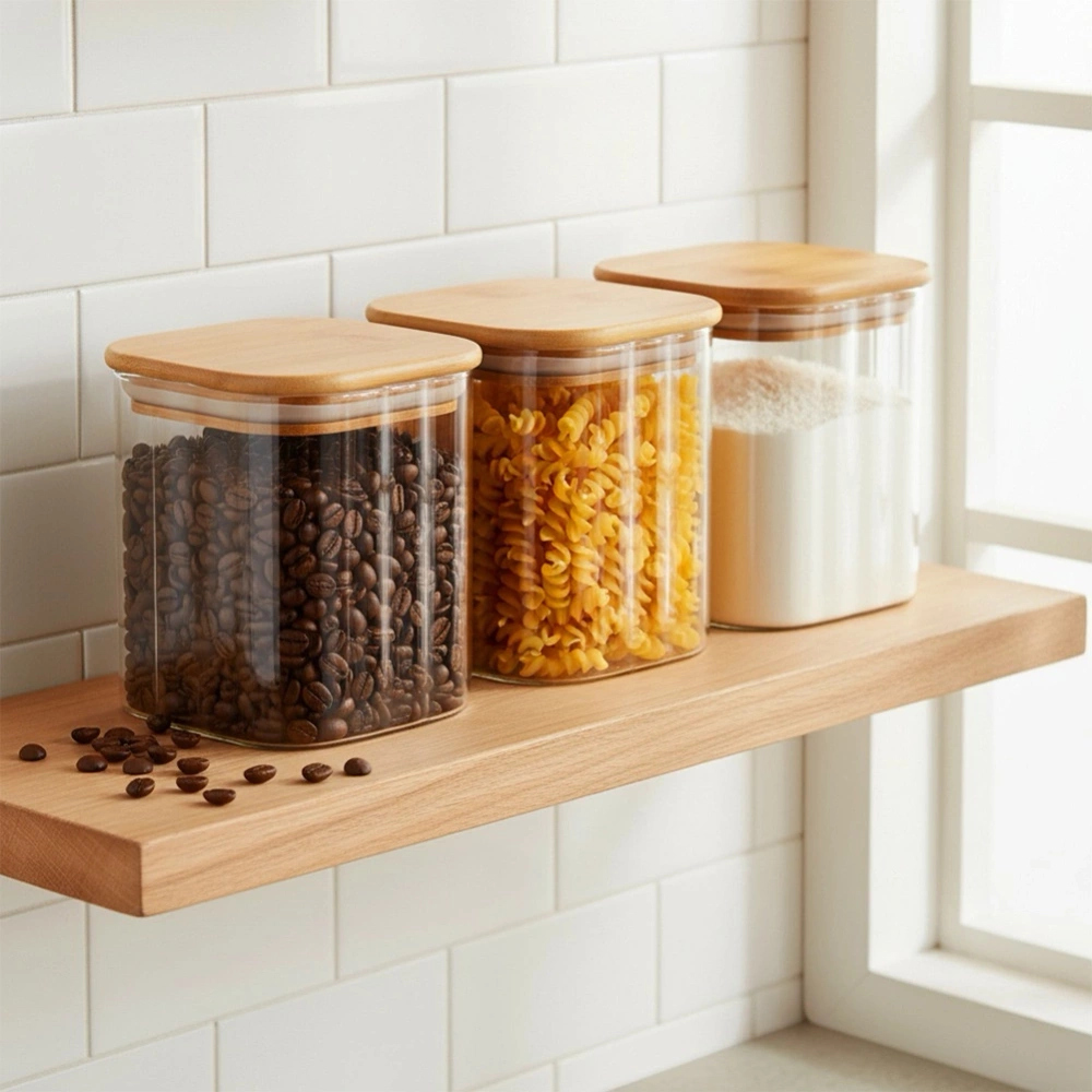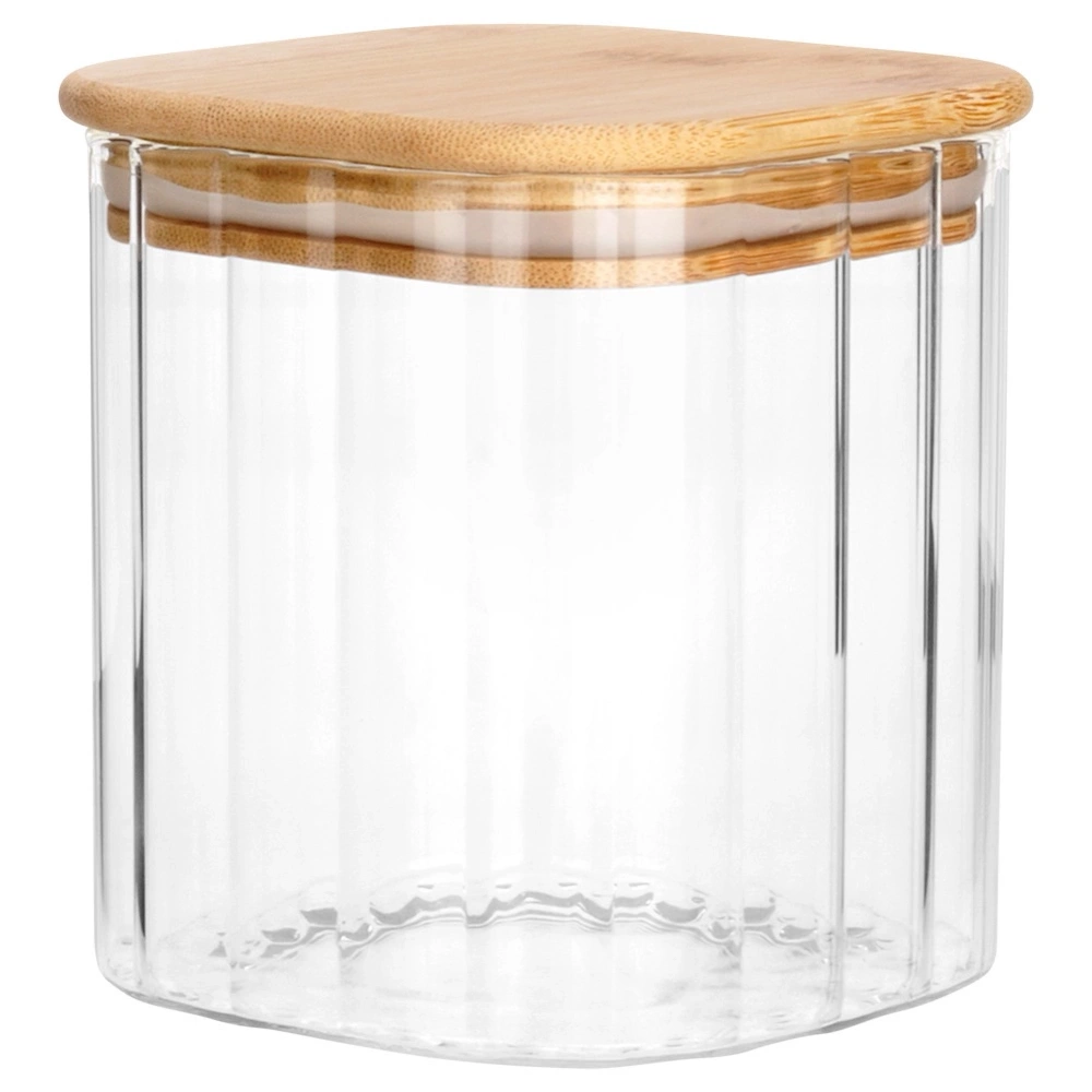 - Kwadratowy pojemnik szklany z drewnianą pokrywką. Idealny do przechowywania różnych produktów spożywczych. Szczelny dzięki silikonowej uszczelce. Nadaje się do zmywarki.