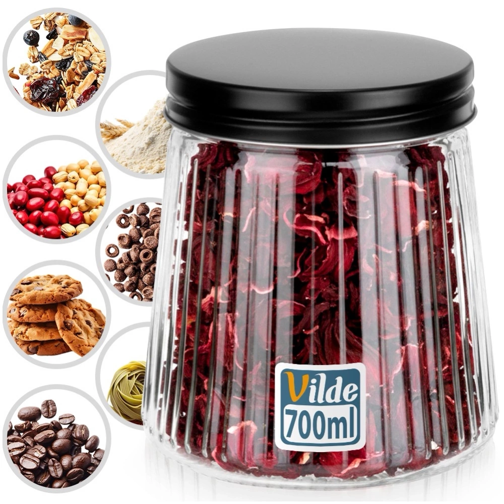 Pojemnik do przechowywania żywności z metalową pokrywką. Nadaje się do przechowywania różnych produktów spożywczych. Znajdzie wiele zastosowań w kuchni. Szczelna pokrywka sprawia, że przechowywane produkty dłużej zachowują świeżość. Przezroczyste szkło pozwoli nam w łatwy sposób sprawdzić zawartość pojemnika i w efektowny sposób wyeksponować ją. Przechowywanie produktów w pojemniku pozwoli na uporządkowanie przestrzeni kuchennej. Oryginalny produkt marki Vilde. Wyprodukowano zgodnie z europejskimi standardami.
