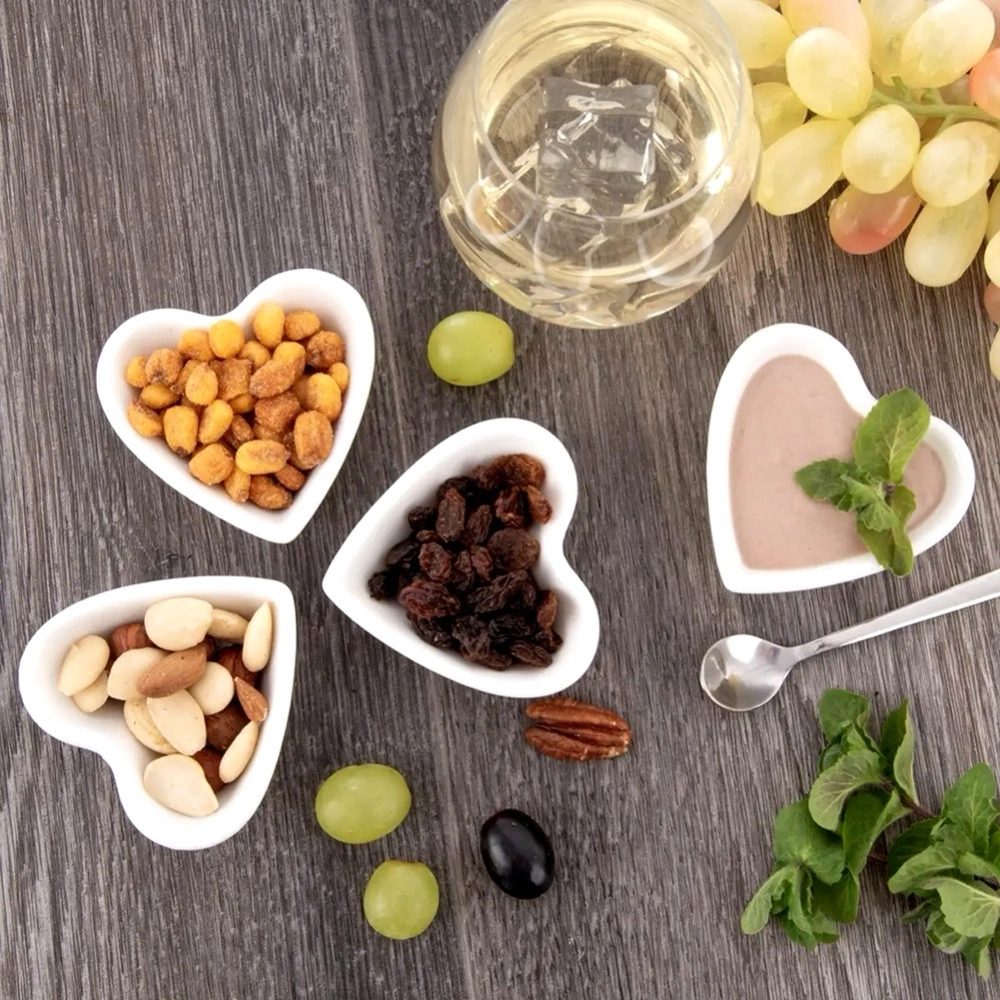 - Zestaw czterech miseczek na przekąski o pojemności 35 ml - Zestaw czterech uniwersalnych miseczek w kształcie serca o pojemności 35 ml. Każda miseczka ma wymiary: 7,5 x 7,5 x 2,5 cm.