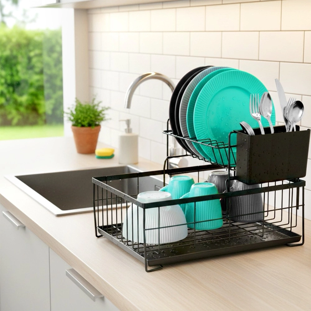 - Elegancka, dwupoziomowa suszarka do naczyń w kolorze czarnym. Posiada miejsce na talerze, szklanki oraz ociekacz na sztućce. Wyposażona w wyjmowaną tacę ociekową.