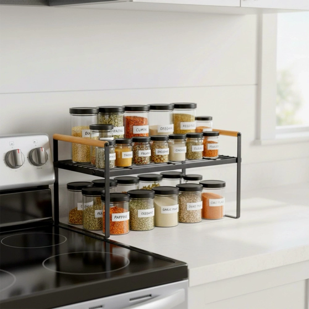 - Solidnie wykonana i stabilna - Wykonana z najwyższej jakości metalu w czarnym kolorze, a uchwyty wykonane z drewna bambusowego. Półka jest wytrzymała i stabilna. To praktyczne rozwiązanie pozwala dopasować ją do różnych przestrzeni - w szafkach, na blacie czy w spiżarni.