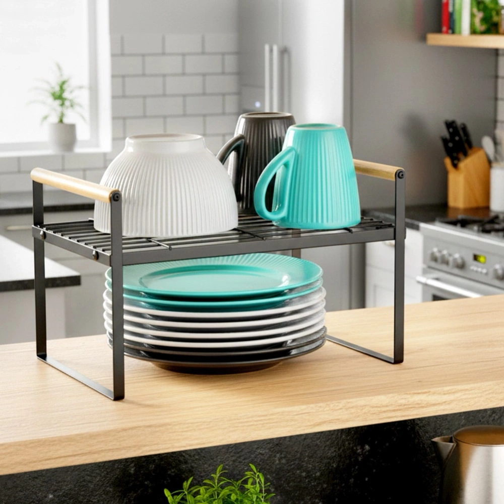- Półka kuchenna idealna do organizacji przestrzeni w szafkach, na blacie lub w spiżarni. Pozwala podzielić wnętrze szafki na dwa poziomy lub stworzyć dodatkowe miejsce do przechowywania na blacie.