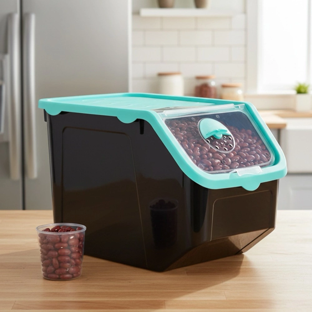 - Praktyczny pojemnik na różnego rodzaju produkty, owoce, warzywa. Pokrywka zamykana na klips, posiada regulacje wentylacji. W zestawie praktyczna miarka.