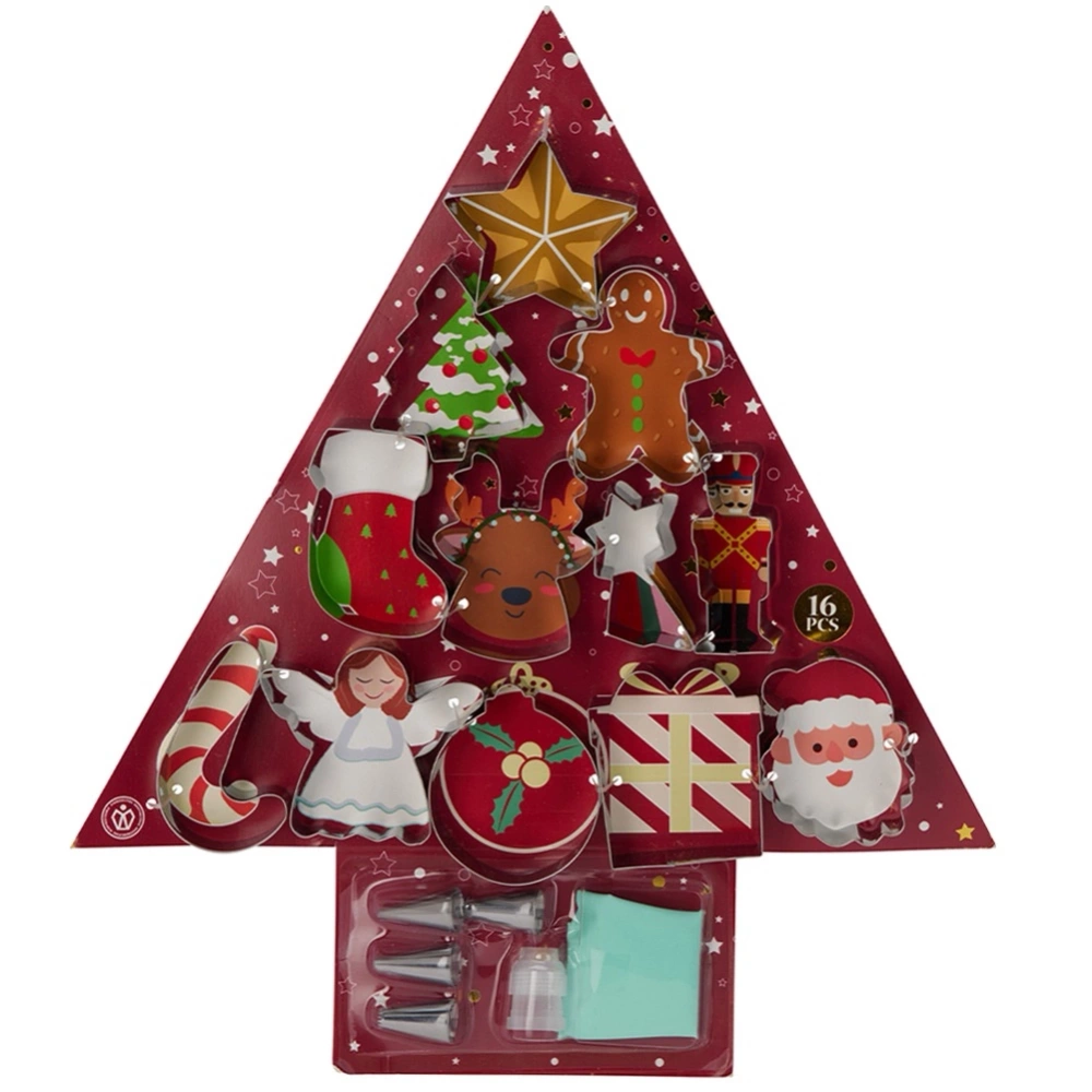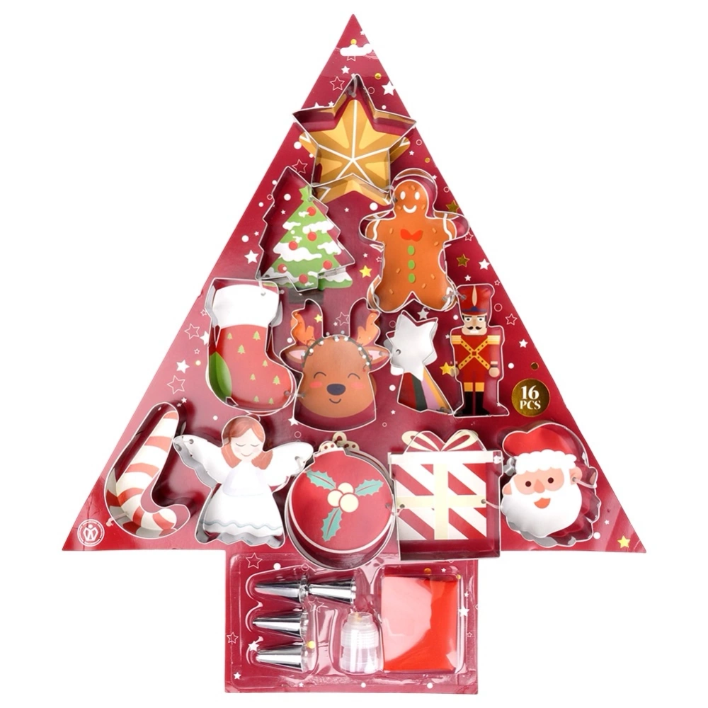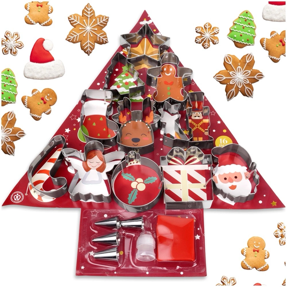 - Kompletny zestaw do wypieku i dekoracji ciastek - Zestaw do pieczenia składający się z 17 elementów, który zawiera wszystko, co potrzebne do stworzenia i udekorowania świątecznych pierniczków i ciasteczek. W komplecie znajduje się 12 wykrawaczy, rękaw cukierniczy oraz 4 końcówki do dekorowania. Całość umieszczona jest w opakowaniu w kształcie choinki.