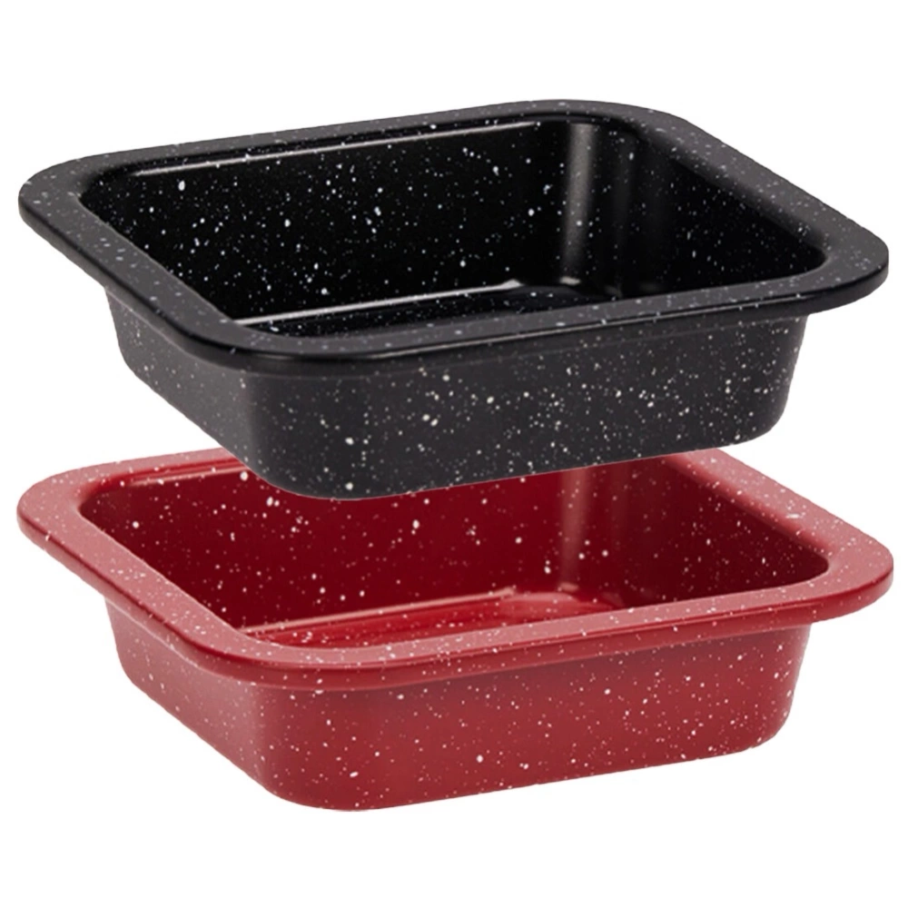 - Zestaw dwóch kwadratowych form do pieczenia. Wykonane ze stali węglowej z powłoką nieprzywierającą. Idealne do wypieku ciast, małych zapiekanek i deserów.