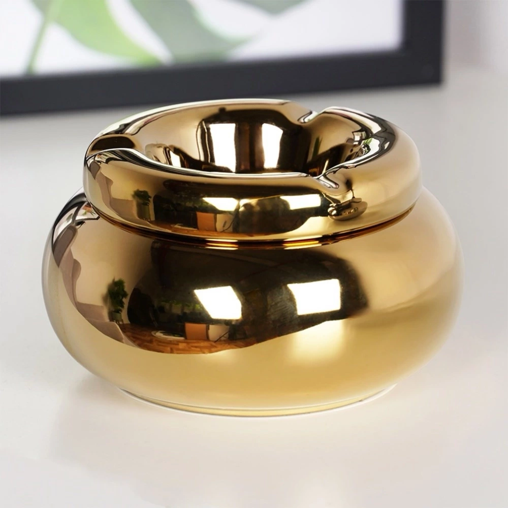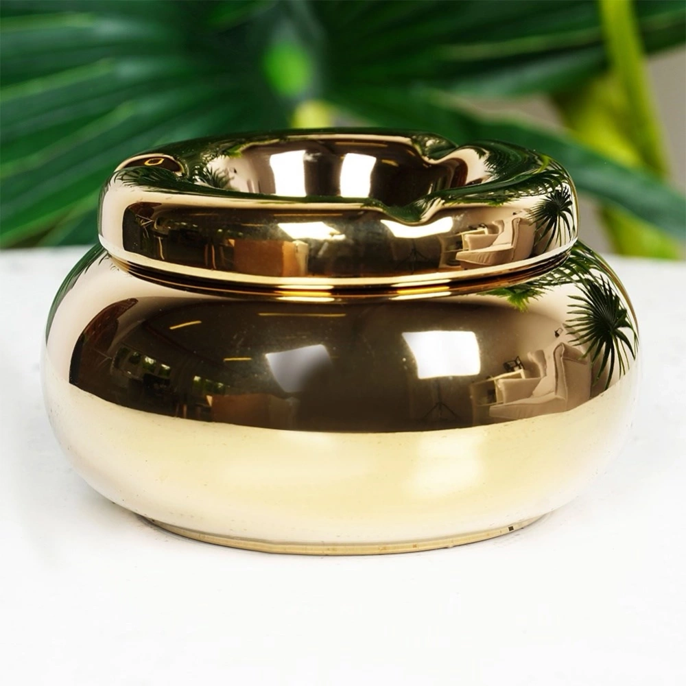 - Efektowna, okrągła popielniczka wykonana z dolomitu malowanego na złoty kolor. Idealnie sprawdzi się podczas użytkowania w domu, ogrodzie, barze oraz restauracji.