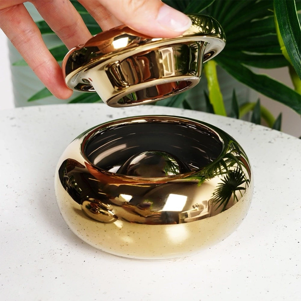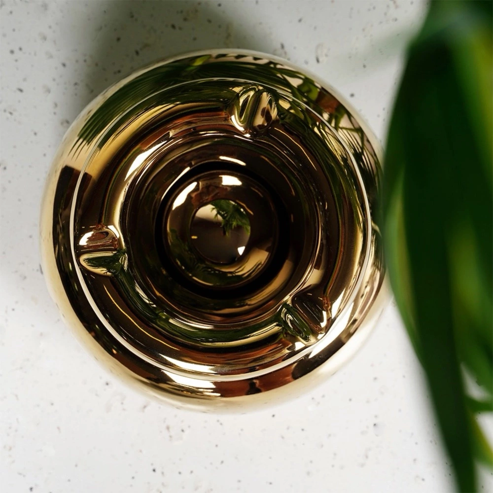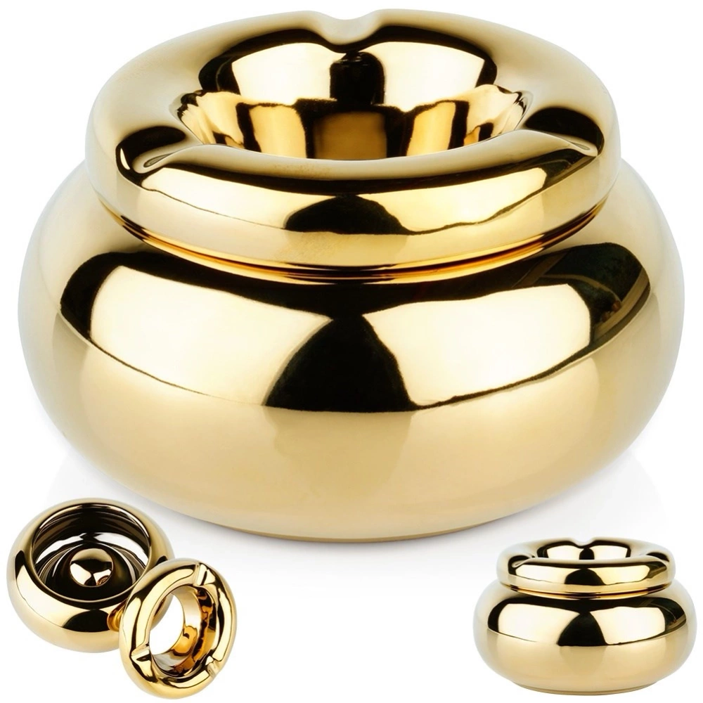Złota popielniczka jest idealna do każdego wnętrza. Świetnie sprawdzi się w domu, na tarasie, ogrodzie czy balkonie. Przydatna, gdy odwiedzają nas osoby palące lub sami palimy papierosy. Może być używana wewnątrz oraz na zewnątrz pomieszczeń. Wyprodukowano zgodnie z europejskimi standardami.