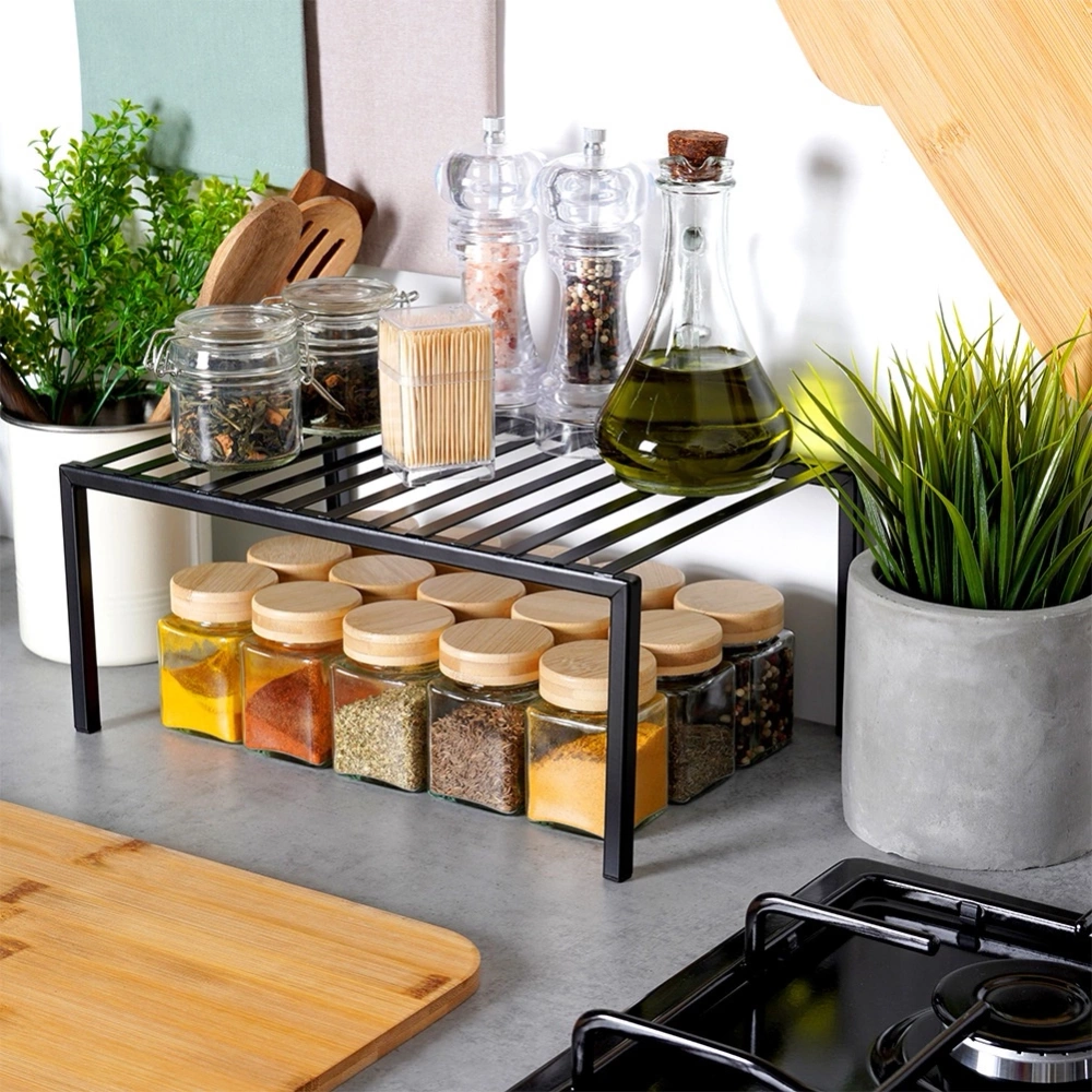 - Solidnie wykonana i stabilna - Wykonana z najwyższej jakości metalu w czarnym kolorze. Półka jest wytrzymała i stabilna. To praktyczne rozwiązanie pozwala dopasować ją do różnych przestrzeni - w szafkach, na blacie czy w spiżarni.
