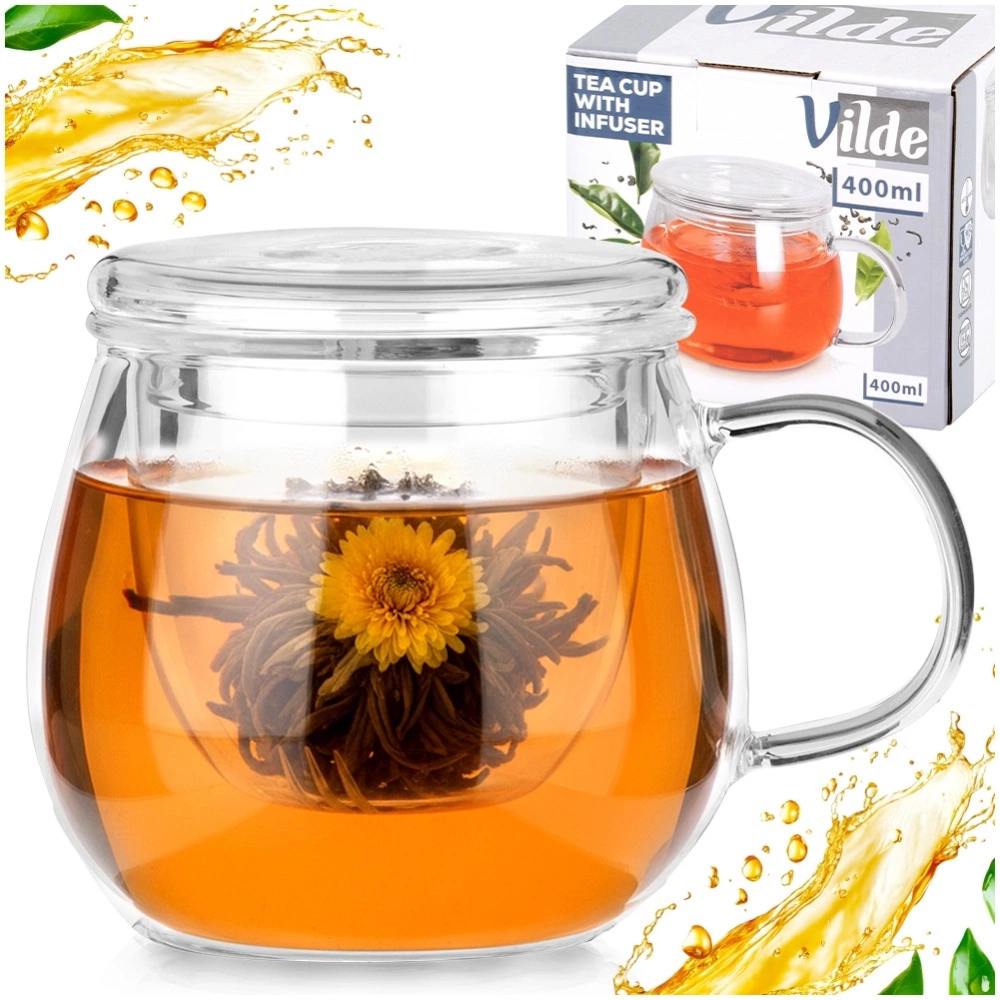 - Szklany kubek z zaparzaczem i pokrywką. Kubek ma pojemność 400 ml. Idealny do parzenia herbaty liściastej, ziół oraz naparów.
