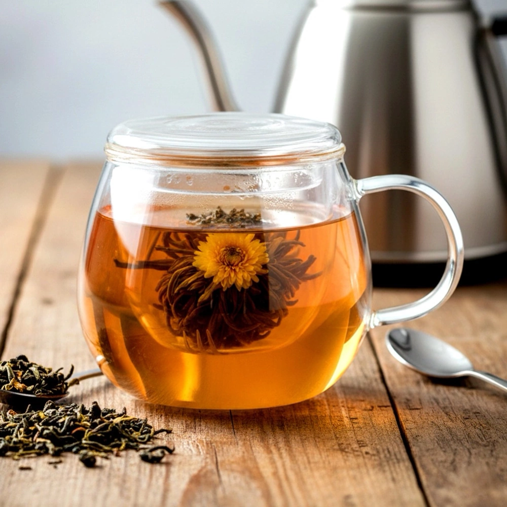 - Wyjmowany szklany zaparzacz - Posiada praktyczny zaparzacz z drobnymi otworami, który skutecznie zatrzymuje liście herbaty i zioła. Po zaparzeniu można go łatwo wyjąć, a napój pozostaje klarowny.