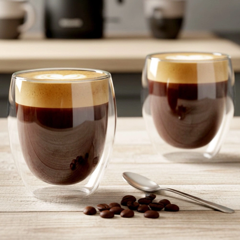 - Szklane z podwójną szklanką - Wykonane z podwójnego szkła borokrzemowego, które utrzymuje temperaturę napoju przez długi czas. Szkło jest przezroczyste. Ciepłe napoje nie schładzają się szybko, a napoje zimne, pozostają dłużej chłodne.