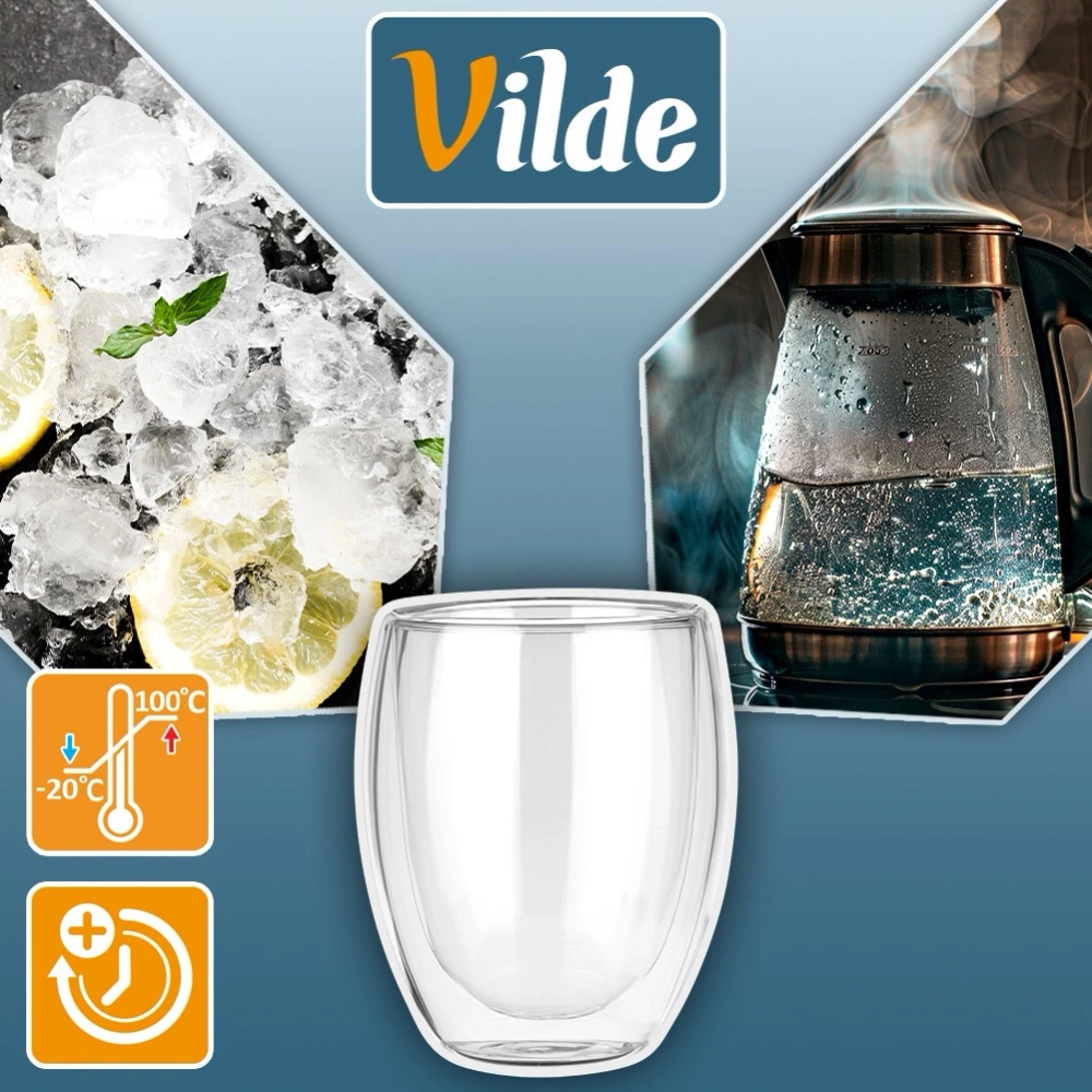 Komplet dwóch szklanek termicznych z podwójną ścianką. Szklanki mają nowoczesny design. Dzięki podwójnej ściance gorące napoje nie będą nas parzyły w ręce i szklanki pozwolą na utrzymanie dłużej ciepłej temperatury, to samo dotyczy chłodnych napojów. Idealne do picia ulubionej kawy, herbaty i innych napojów. Szklanki są świetnym pomysłem na prezent. Oryginalny produkt marki Vilde. Wyprodukowano zgodnie z europejskimi standardami.