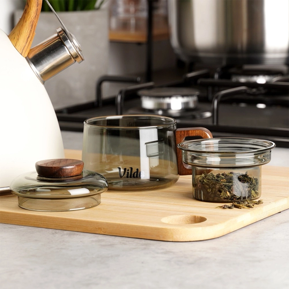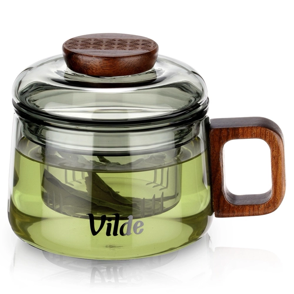 - Szklanka z zaparzaczem i pokrywką. Szklanka ma pojemność 240 ml. Idealna do parzenia herbaty liściastej, ziół oraz naparów. Posiada uchwyty wykonane z drewna.