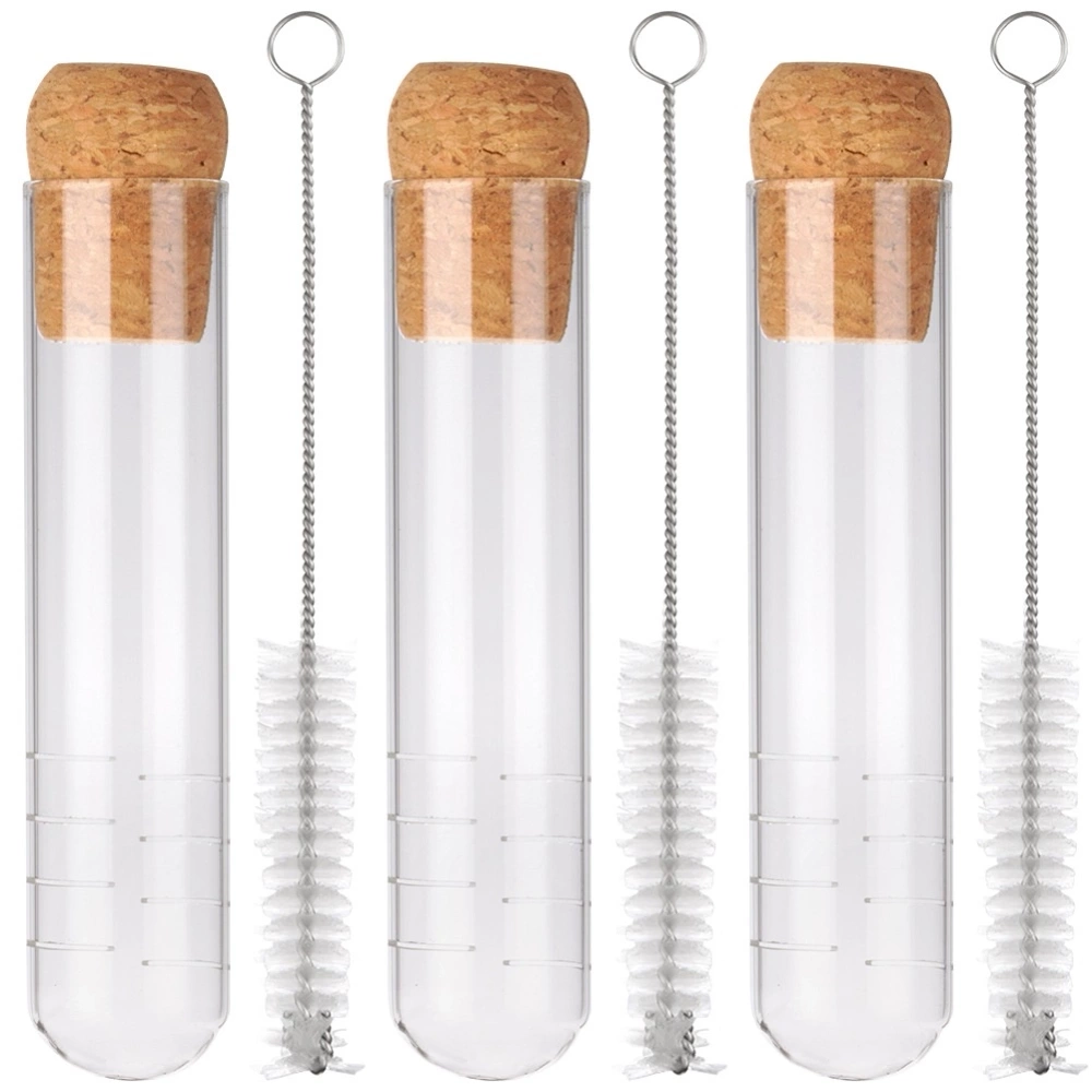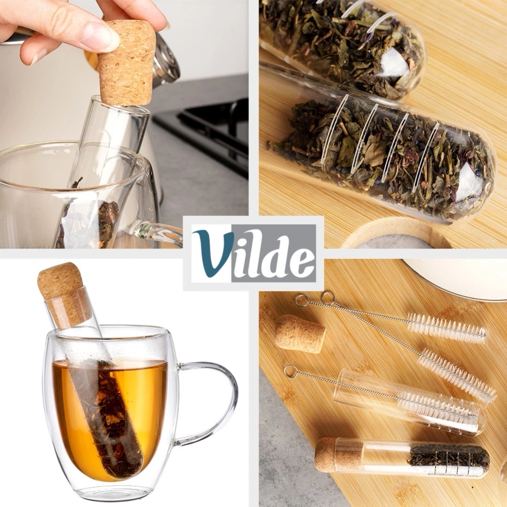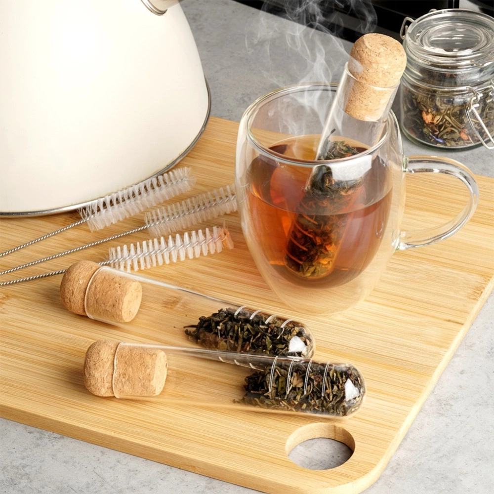 - Zestaw 3 sitek zaparzaczy do herbaty lub ziół w kształcie fiolki - Praktyczny zestaw zaparzaczy do herbaty liściastej lub ziół w zestawie ze szczotkami do czyszczenia. Zaparzacze wraz z korkiem mają wymiary 3 x 14,5 cm i doskonale sprawdza się do przygotowywania aromatycznych naparów w filiżance, kubku lub szklance.