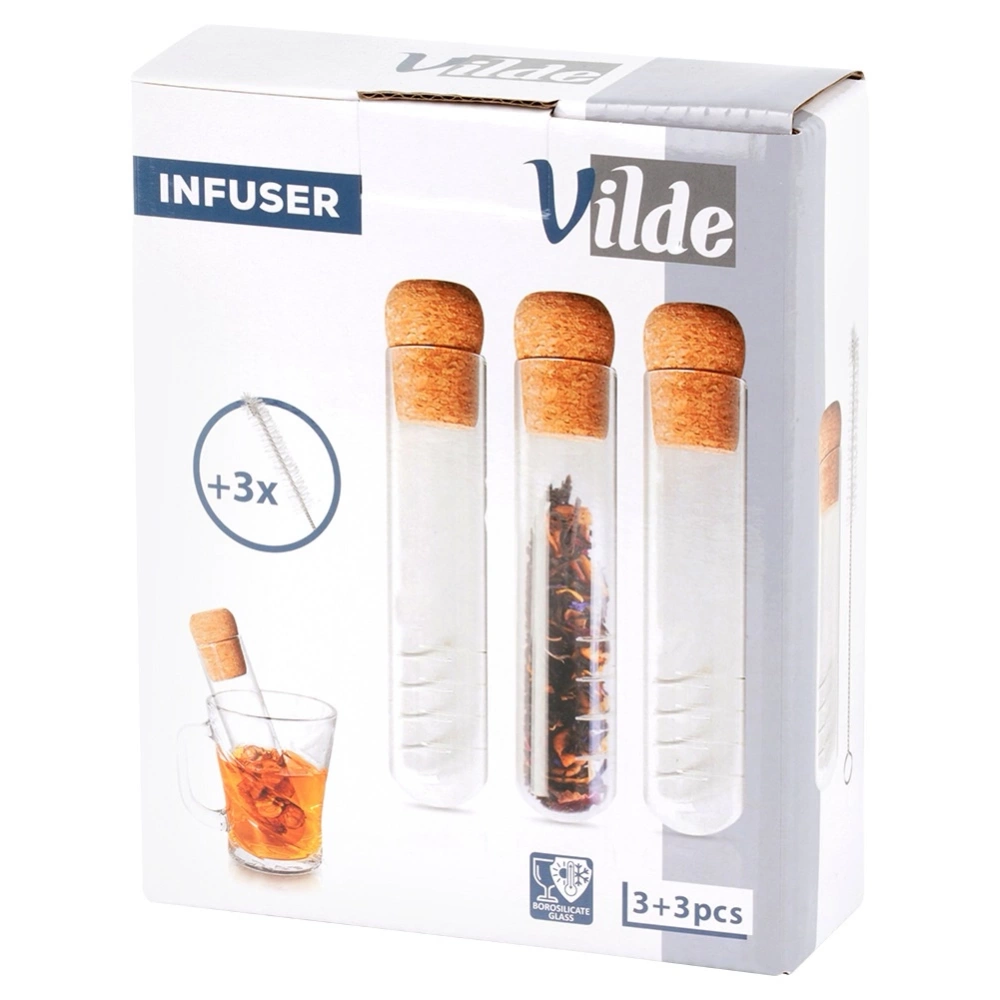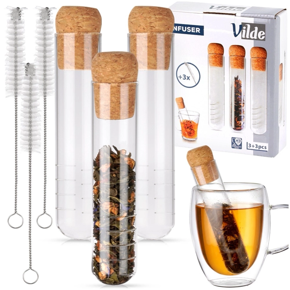 - Zestaw trzech zaparzaczy do herbaty lub ziół w kształcie fiolki. Wykonane w całości ze szkła, posiadają zamknięcie z korka. Efektownie prezentuje się umieszczone w kubku.