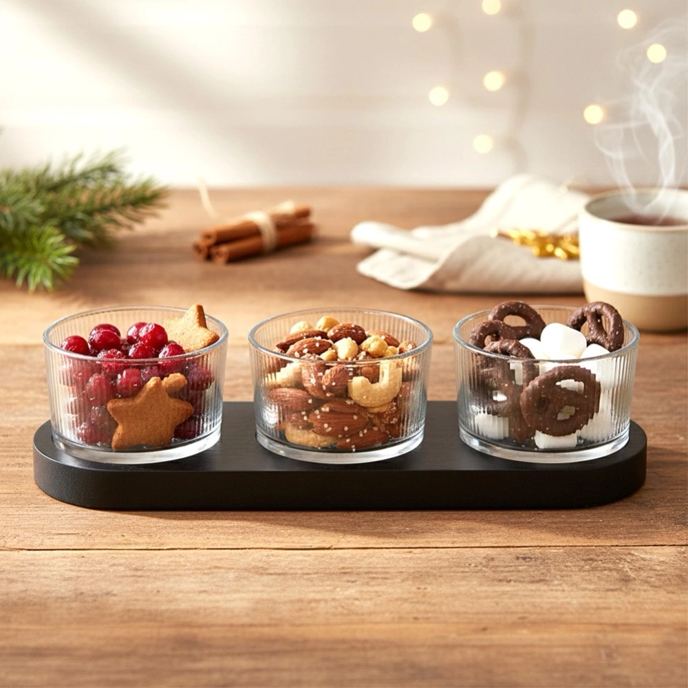 - 4-elementowy zestaw do serwowania przekąsek. Zawiera trzy szklane miseczki z tłoczonym wzorem w paski oraz czarną tacę z drewna sosnowego o wymiarach 30 x 10 cm. Zapakowany w pudełko prezentowe.