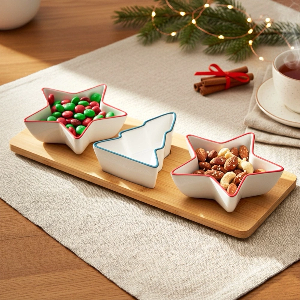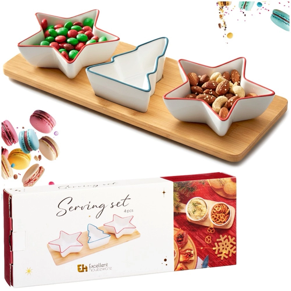 - 4-elementowy zestaw do serwowania przekąsek. Zawiera trzy porcelanowe miseczki w świątecznych kształtach oraz bambusową tacę. Idealne do serwowania przekąsek, przystawek, sosów, dipów.