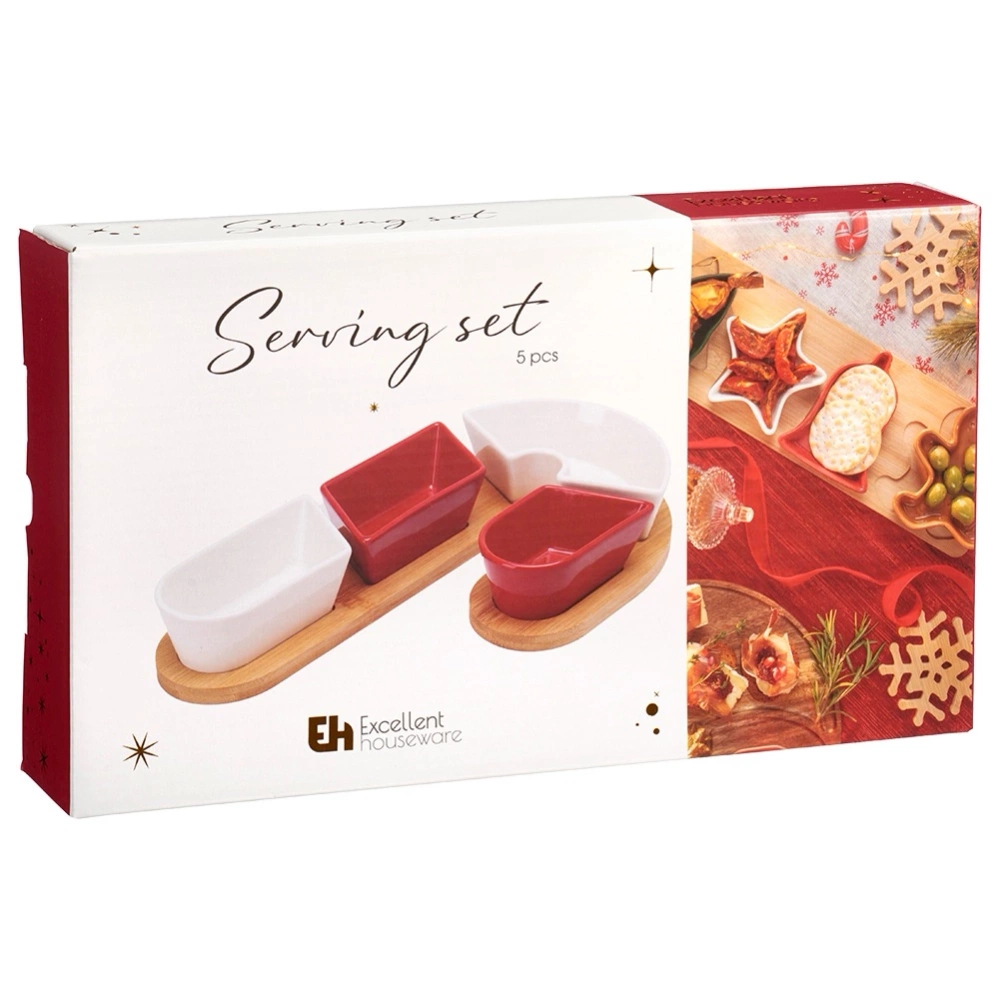 - Zestaw do serwowania przekąsek z tacą - 5-elementowy zestaw do serwowania, składający się z bambusowej deski oraz miseczek w różnych rozmiarach. Całość tworzy kształt świątecznej laski cukrowej, co czyni go idealnym do podawania przekąsek podczas świątecznych spotkań. Taca wraz z miseczkami ma wymiary: 29 x 17 x 4,5 cm.