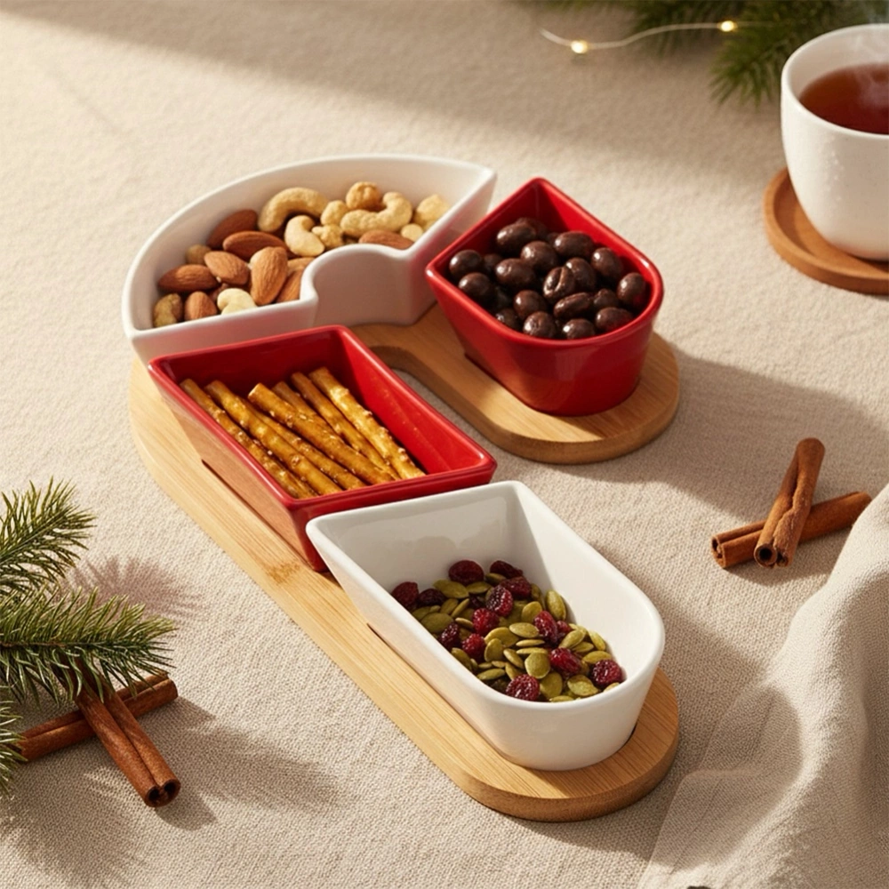 - 5-elementowy zestaw do serwowania przekąsek w kształcie laski cukrowej. Zawiera cztery ceramiczne miseczki w różnych rozmiarach (białe i czerwone) oraz bambusową deskę.