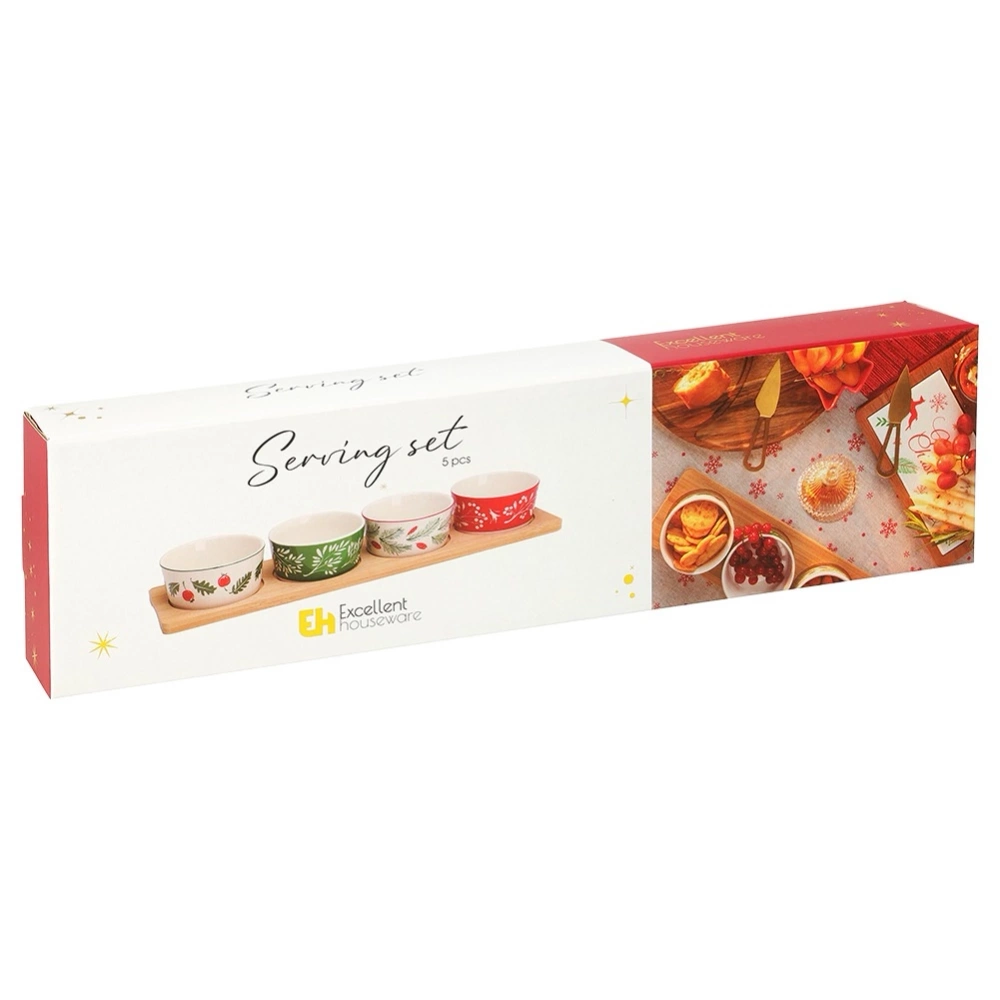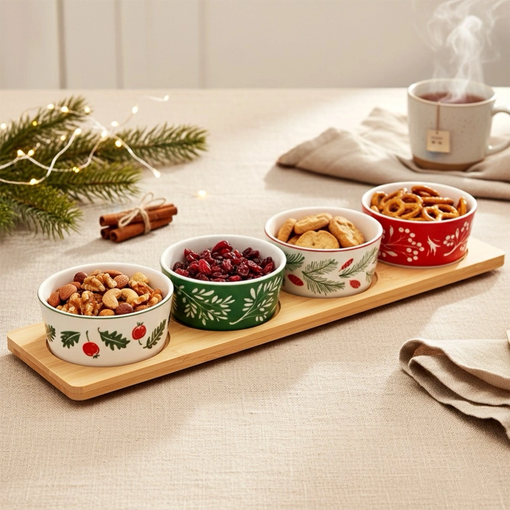 - 5-elementowy zestaw do serwowania przekąsek. Zawiera cztery porcelanowe miseczki z różnymi świątecznymi wzorami oraz bambusową tacę. Idealne do serwowania przekąsek, sosów, dipów.