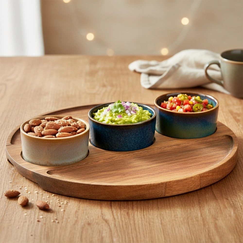- 4-elementowy zestaw do serwowania przekąsek. Zawiera trzy ceramiczne miseczki oraz okrągłą tacę z drewna akacjowego. Idealne do serwowania przekąsek, sosów, dipów.