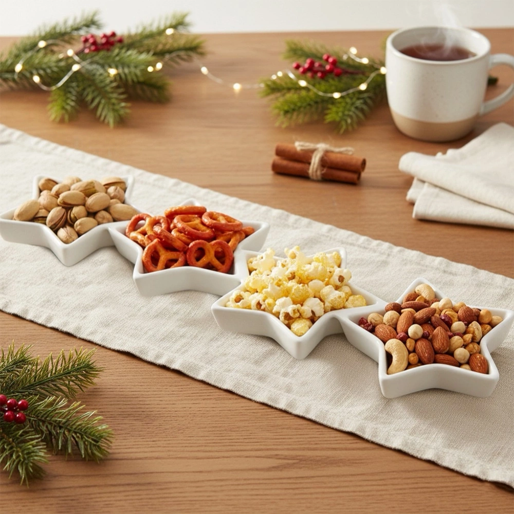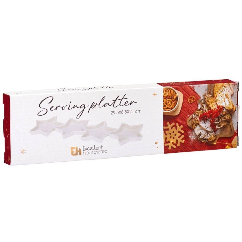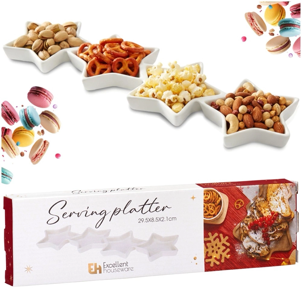 - Podłużny talerz w kształcie gwiazdek do serwowania przekąsek. Wykonany z białej porcelany, posiada cztery wgłębienia w kształcie gwiazd.