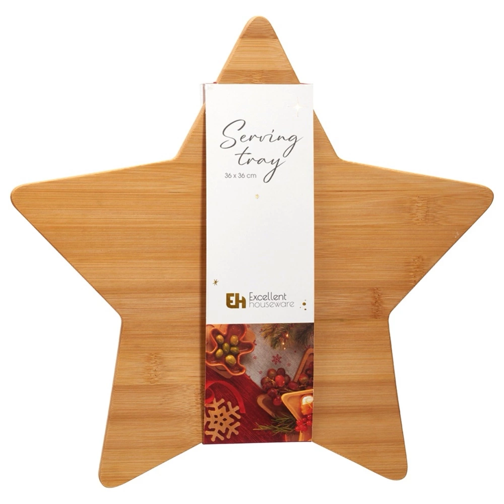 - Taca w kształcie gwiazdy o wymiarach 36 x 36 cm. Wykonana jest z drewna bambusowego. Idealna do serwowania przekąsek, wędlin, owoców itp.