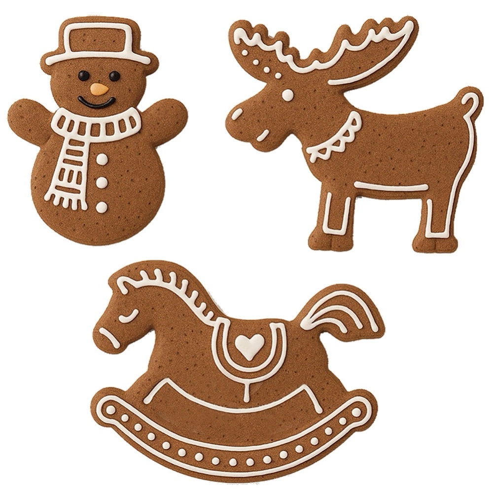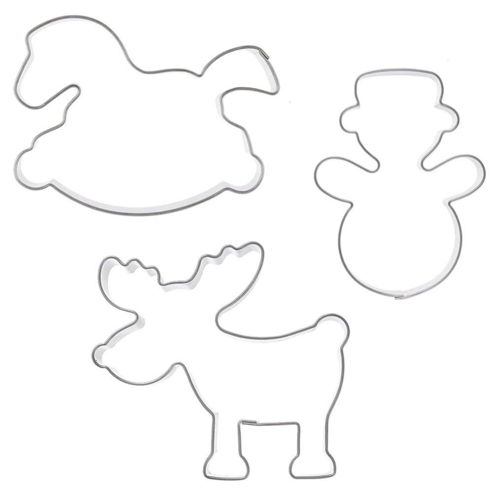 - Zestaw trzech wykrawaczy w kształcie: konika na biegunach, bałwana i renifera. Wykonane ze stali nierdzewnej. Idealne do wykrawania ciasteczek i pierników.