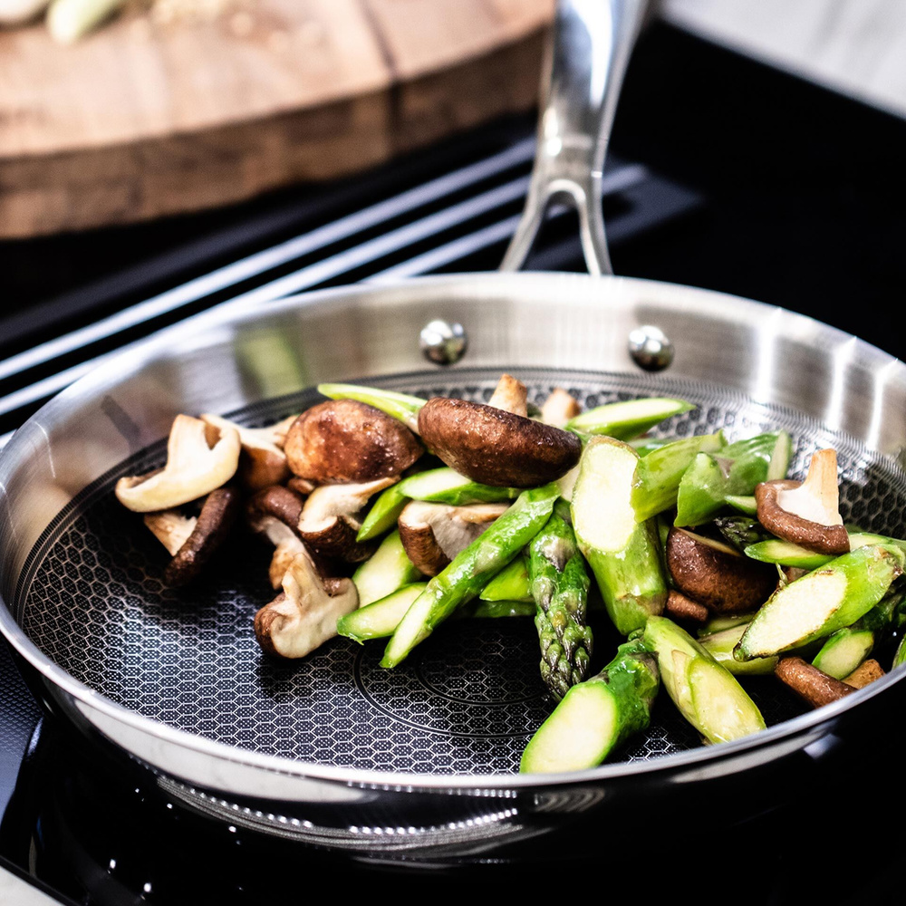 Wykonana ze stali nierdzewnej, patelnia jest odporna na wysokie temperatury oraz zarysowania, co zapewnia jej długotrwałe użytkowanie. Unikalna struktura dna w kształcie plastra miodu skutecznie zapobiega przywieraniu potraw, a system dozowania oleju umożliwia precyzyjne przygotowanie dań. ⭐