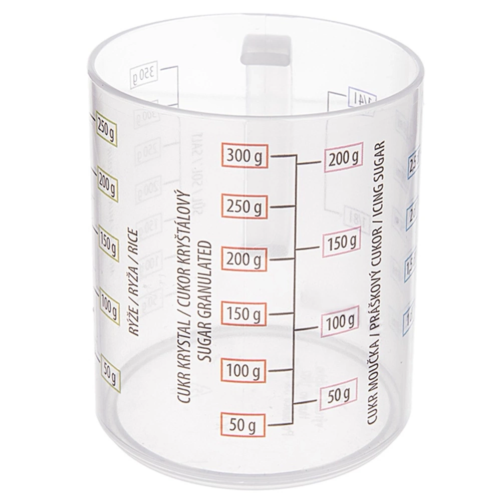 - Kubek z miarką do odmierzania produktów sypkich i płynnych. Wyposażony w 5 czytelnych podziałek, które pozwolą odmierzyć mąkę, cukier, ryż, sól i płyny.