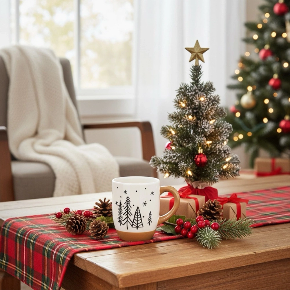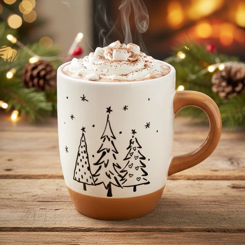 - Kubek 330 ml do picia kawy, herbaty i innych napojów. Kubek jest wykonany z białej ceramiki z efektownym wzorem choinek. Posiada wygodny uchwyt.
