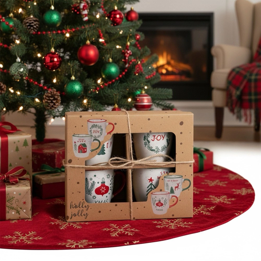 - Zestaw 4 kubków o pojemności 180 ml, wykonanych z kamionki. Każdy kubek posiada inny świąteczny napis. Nadają się do zmywarki i mikrofalówki.
