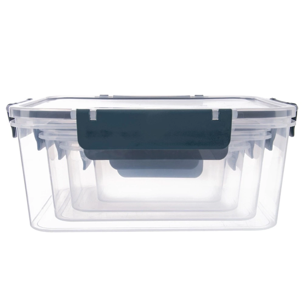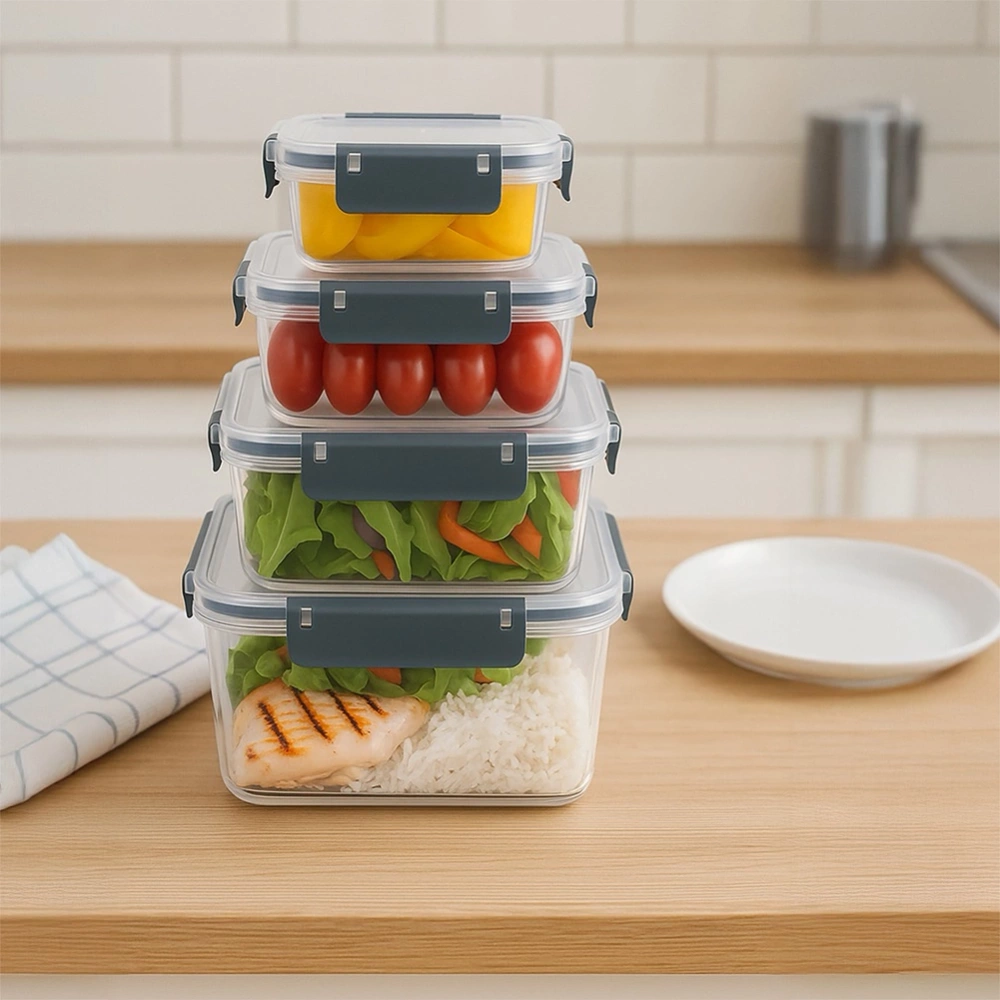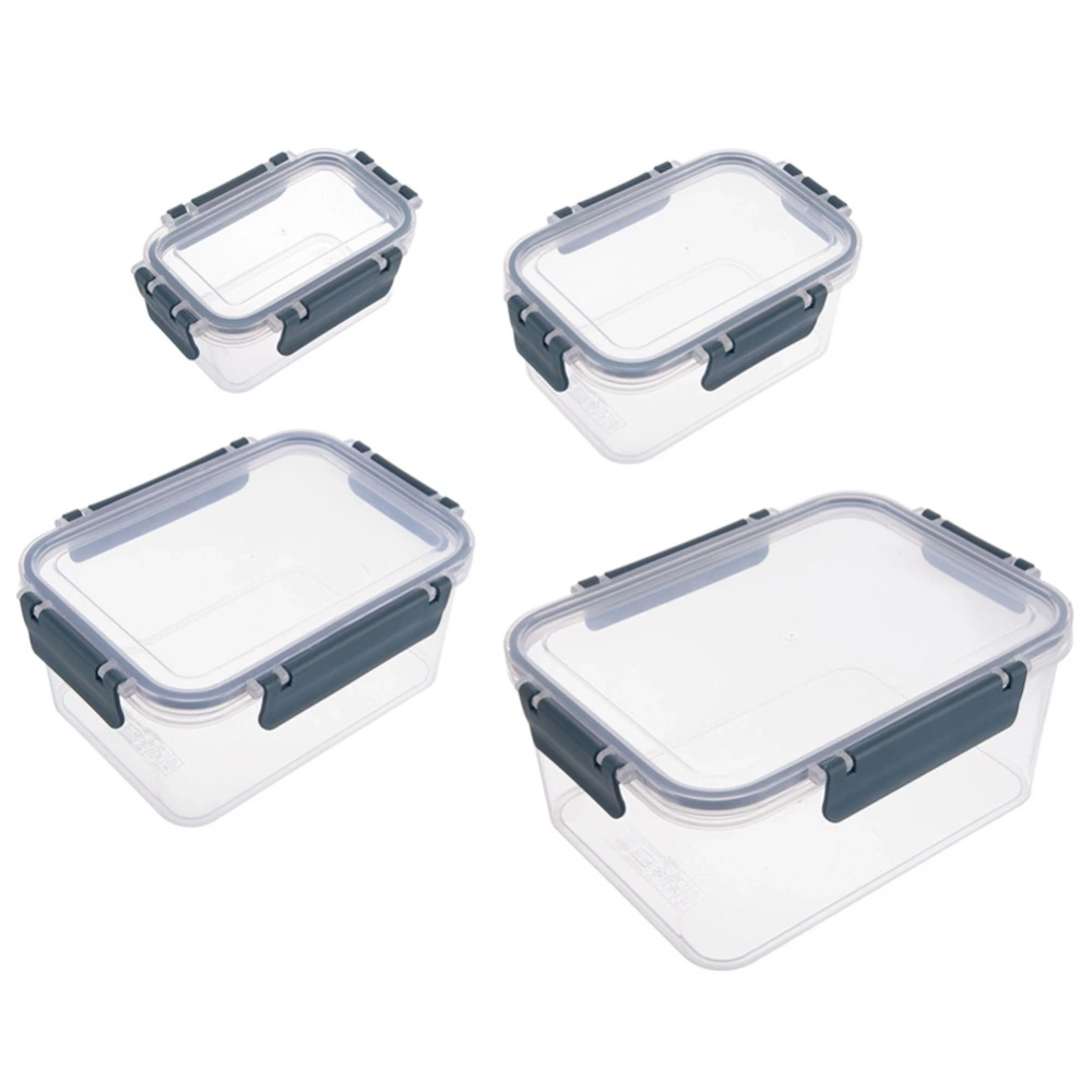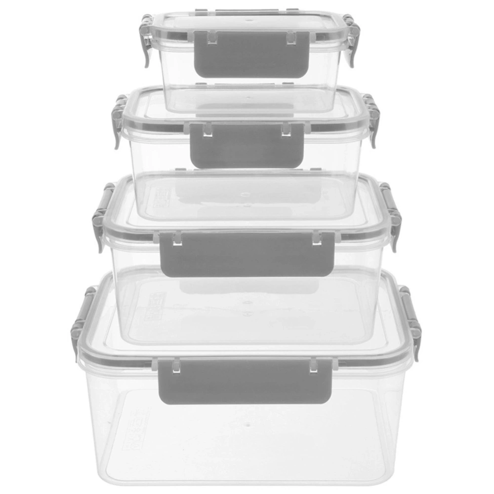 - Zestaw 4 pojemników na żywność - Zestaw 4 szt. pojemników kuchennych z pokrywkami do przechowywania żywności i produktów sypkich. W zestawie prostokątne pojemniki w czterech różnych pojemnościach 375 ml, 900 ml, 1,7 l i 2,85 l. Pojemniki można wygodnie przechowywać umieszczając je w największym pojemniku.