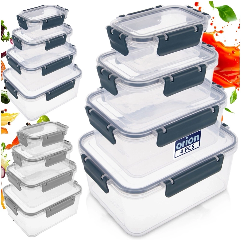 Zestaw pojemników kuchennych w różnych rozmiarach. W zestawie: 1x pojemnik o wymiarach 24,5 x 19 x 10 cm i pojemności 2,85 l, 1x pojemnik o wymiarach 21 x 15,5 x 8,5 cm i pojemności 1,7 l, 1x pojemnik o wymiarach 18 x 12,5 x 7 cm i pojemności 900 ml i 1x pojemnik o wymiarach 14,5 x 9,5 x 5,5 cm i pojemności 375 ml. Przydatne w każdej kuchni. Pozwolą na odpowiednie przechowywanie produktów, wprowadzając ład i porządek do kuchni. Oryginalny produkt czeskiej marki Orion. Wyprodukowano zgodnie z europejskimi standardami.
