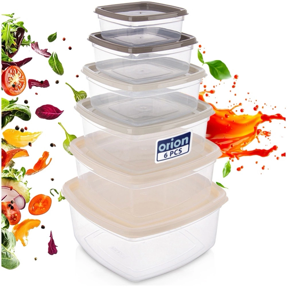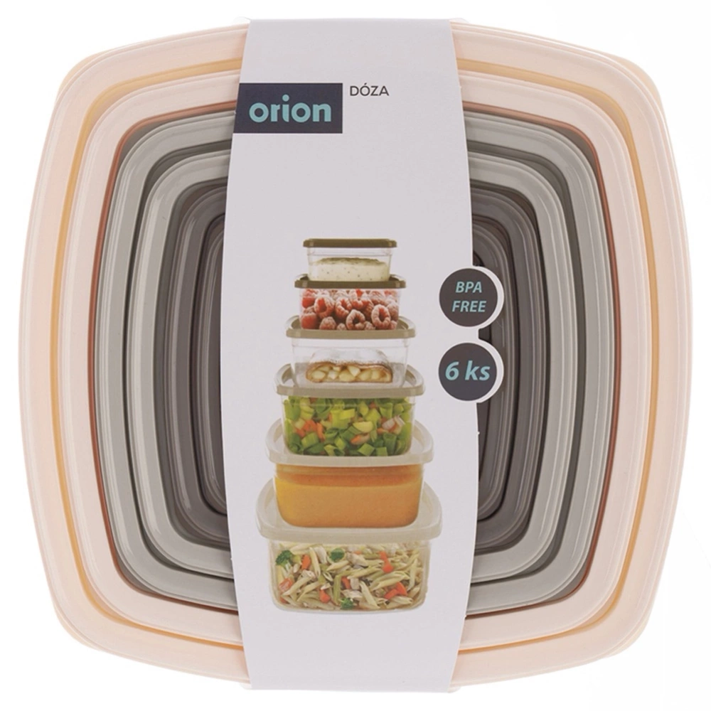 Zestaw pojemników kuchennych w różnych rozmiarach. W zestawie: pojemnik o wymiarach 21 x 21 x 10 cm i pojemności 3,2 l, pojemnik o wymiarach 18,5 x 18,5 x 9 cm i pojemności 2,1 l, pojemnik o wymiarach 16,5 x 16,5 x 7,5 cm i pojemności 1,35 l, pojemnik o wymiarach 14 x 14 x 6,5 cm i pojemności 850 ml, pojemnik o wymiarach 12 x 12 x 5,5 cm i pojemności 500 ml i pojemnik o wymiarach 10 x 10 x 4,5 cm i pojemności 275 ml. W wygodny sposób sprawdzimy zawartość pojemnika bez konieczności otwierania go. Przydatne w każdej kuchni. Pozwolą na odpowiednie przechowywanie produktów, wprowadzając ład i porządek do kuchni. Oryginalny produkt czeskiej marki Orion. Wyprodukowano zgodnie z europejskimi standardami.