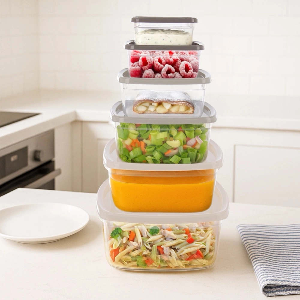 - Zestaw 6 pojemników kuchennych różnych rozmiarach. Idealne do przechowywania żywności oraz produktów sypkich. Nadają się do zmywarki, lodówki, zamrażarki.