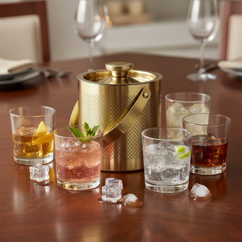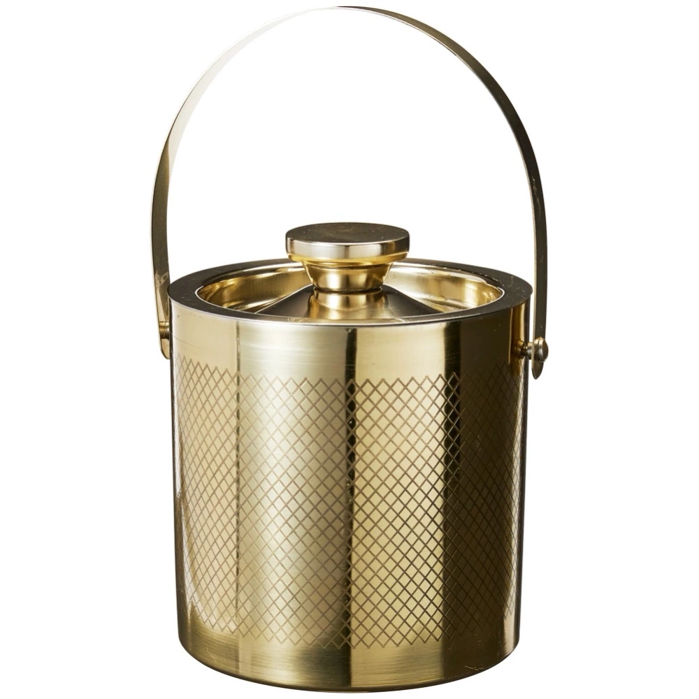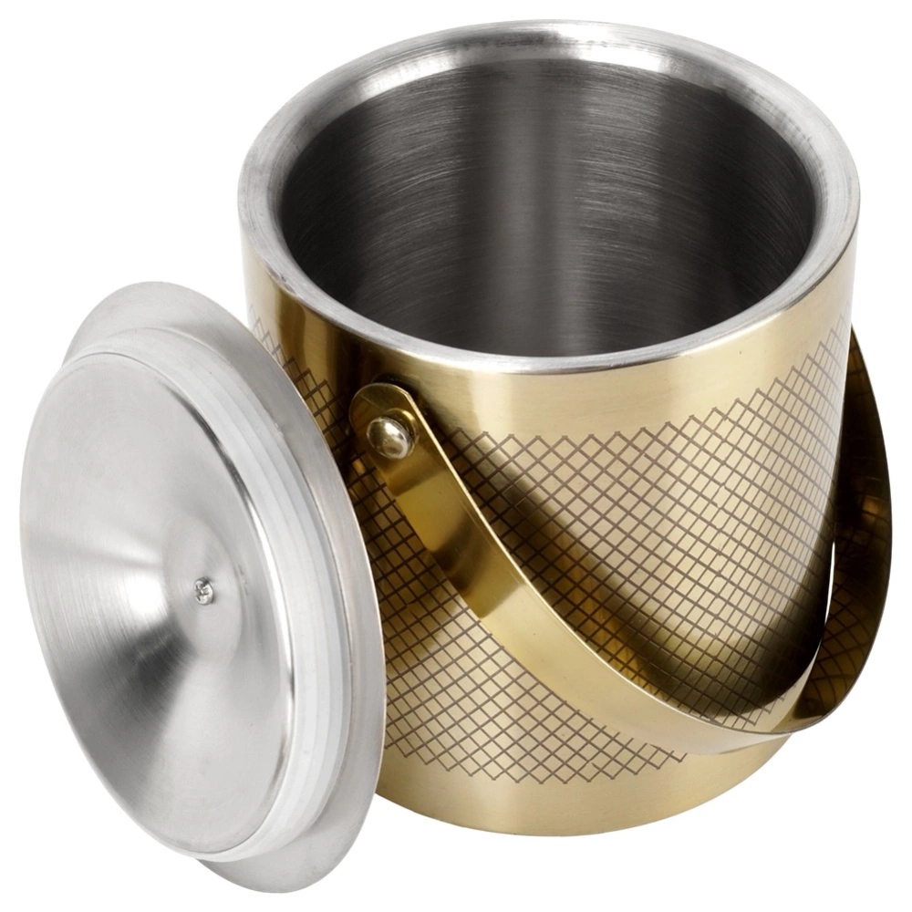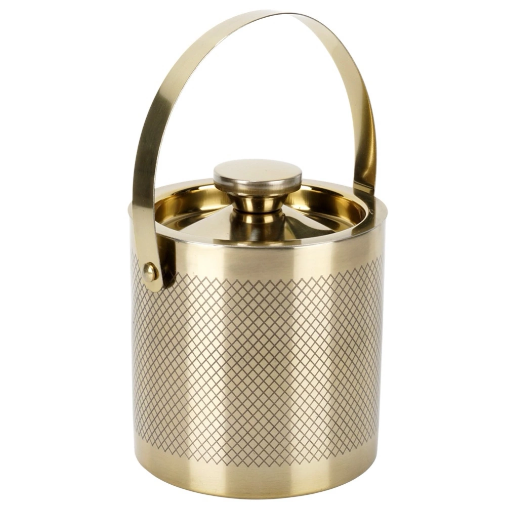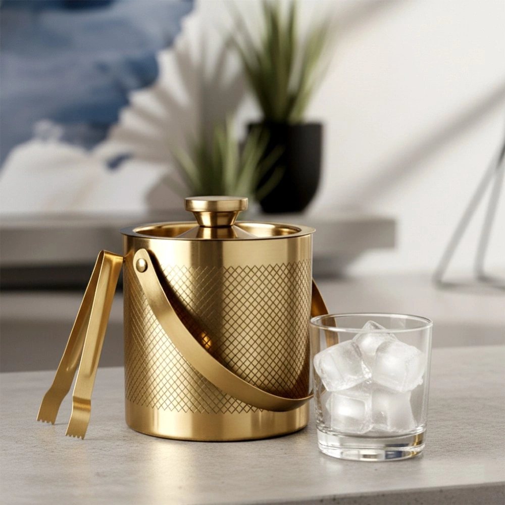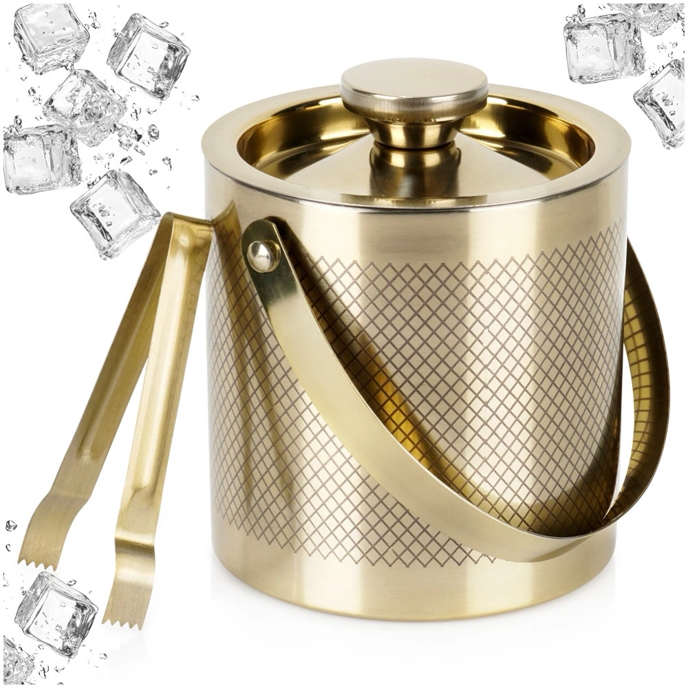 Stylowe wiaderko do lodu łączy nowoczesne wzornictwo z praktycznym zastosowaniem. Wykonane z trwałej stali nierdzewnej w złotym kolorze, posiada szczypce i szczelną pokrywkę z uszczelką silikonową. To elegancki dodatek do stołu i barku, idealny do chłodzenia napojów i serwowania drinków. Wyprodukowano zgodnie z europejskimi standardami.