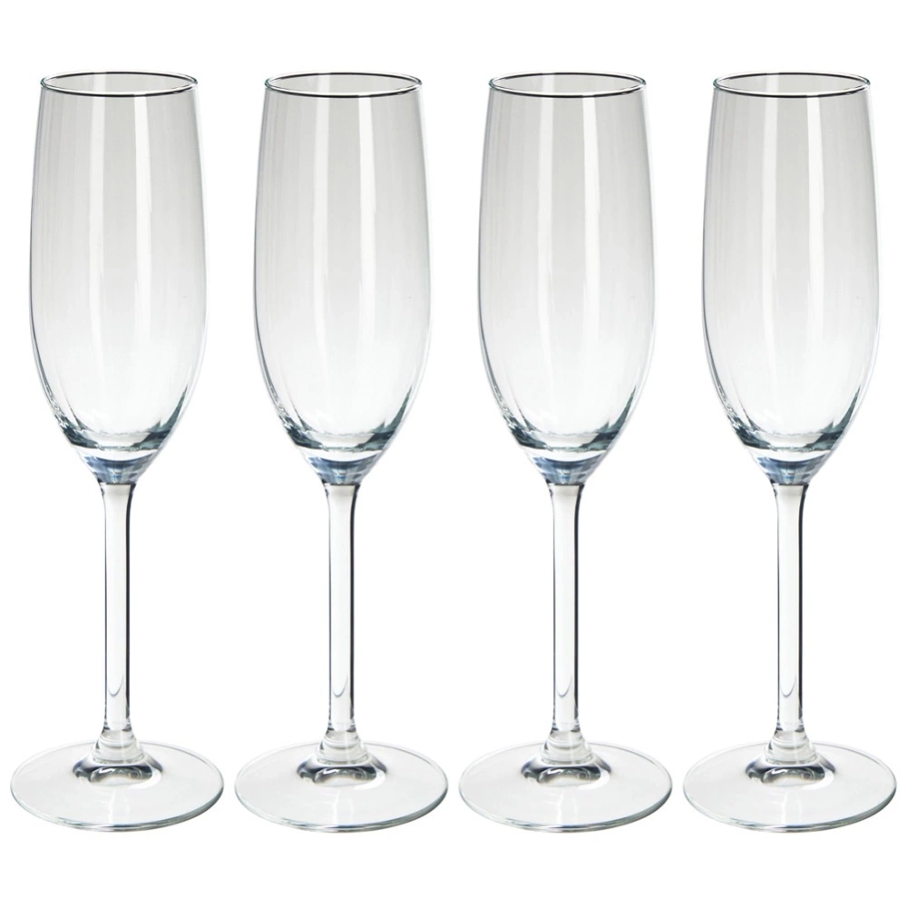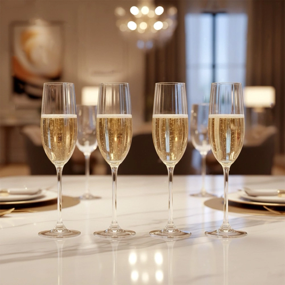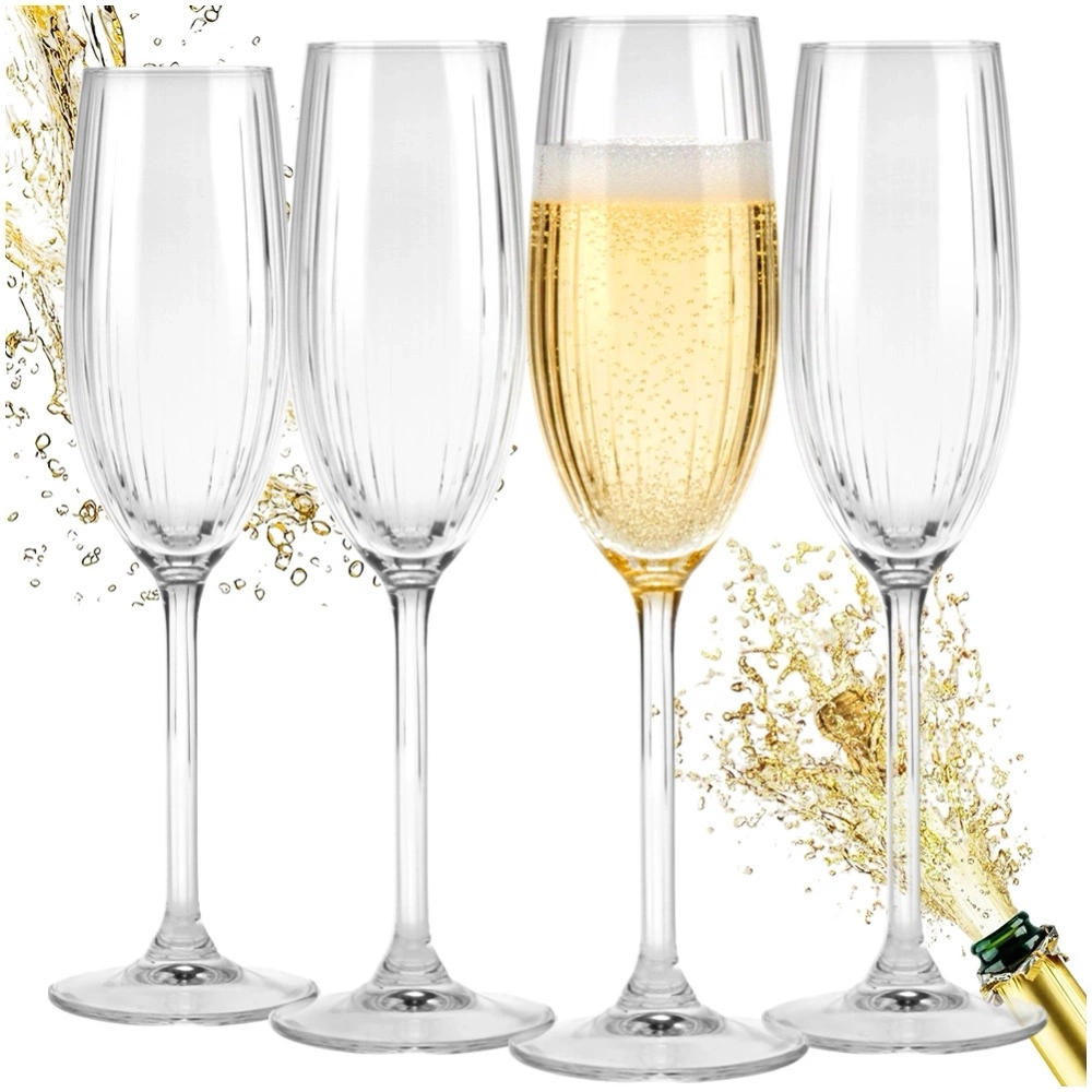 - Zestaw 4 kieliszków do szampana - Elegancki komplet kieliszków przeznaczony do serwowania szampana, prosecco oraz innych win musujących. Każdy kieliszek ma pojemność 210 ml, średnicę 4,5 cm i wysokość 23 cm.