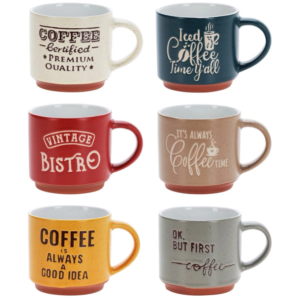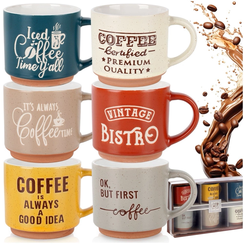 - Zestaw kolorowych kubków do kawy o pojemności 230 ml. Kubki wykonane z ceramiki w różnych kolorach z efektownymi napisami odnoszącymi się do kawy.
