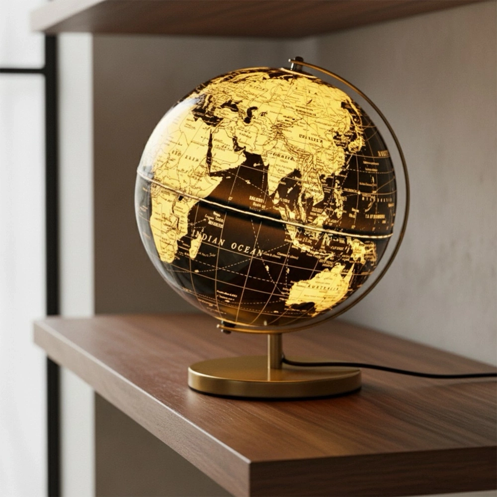 - Dekoracyjna lampka stołowa w formie globusa. Wyposażona w 4 ciepłe diody LED zapewniające nastrojowe oświetlenie. Zasilanie odbywa się za pomocą przewodu USB.
